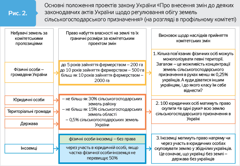 Наприкінці 2018 р. питання заборони відчуження земель, їх обігу, ринку земель постало досить гостро. Парламентський комітет з питань аграрної політики та земельних відносин самостійно, не очікуючи пропозицій від уряду, розглянув пропозиції до законодавчих змін для нормативно-правового регулювання обігу земель сільськогосподарського призначення. Так, на розгляді в комітеті перебуває проект закону України "Про внесення змін до деяких законодавчих актів України щодо регулювання обігу земель сільськогосподарського призначення" (див. рис. 2).