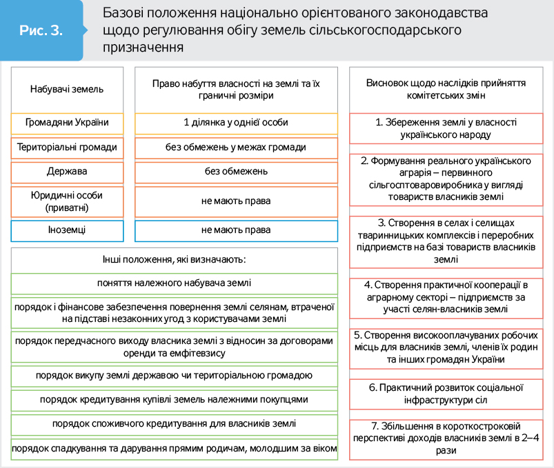 Згідно з комітетськими положеннями іноземці та особи без громадянства не можуть бути власниками земель сільськогосподарського призначення. При цьому юридичні особи, зареєстровані за законодавством України, можуть бути власниками землі за умови трирічної сільськогосподарської діяльності та лише у випадку, якщо участь іноземців в юридичній особі буде меншою за 50%. Фактично іноземцям залишають варіант скупити українську землю через юридичних осіб-посередників, але через три роки.