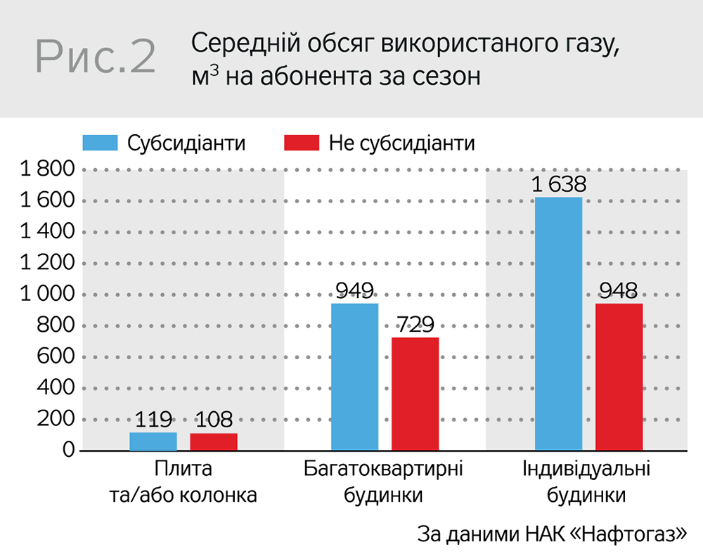 Згідно з результатами аналізу директора Фонду екологічних інвестицій Олексія Хабатюка, система субсидій і пільг фактично знизила середню ціну на газ для населення у 2015 р. в 1,6 разу. Причому таке зниження відбулося нерівномірно між різними групами споживачів. Одержувачі субсидій практично не платили за спожитий газ власними коштами, тому що встановлені державою соціальні норми, у межах яких надається субсидія, значно перевищують фактичне споживання. Це призвело до демотивації субсидіантів до скорочення споживання газу, фінансової зацікавленості в такій економії у них немає.