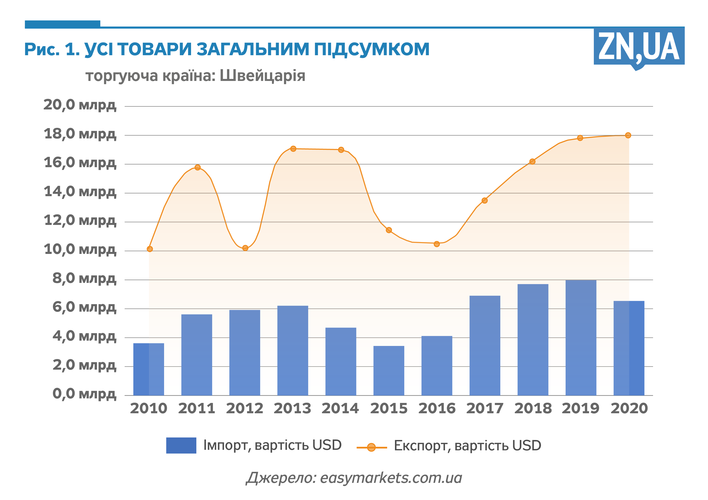 На просте запитання, хто є основним торговельним партнером України, зазвичай отримуєш просту відповідь: ЄС, Китай, РФ. Саме ці країни в топі всіх офіційних звітів про наші зовнішньоторговельні операції. Про маленьку Швейцарію у цих звітах зазвичай узагалі не згадується. Їй не потрібен наш сировинний експорт, нам здебільшого не по кишені швейцарські товари та послуги. Втім, саме вона є найбільшим торговельним партнером України.