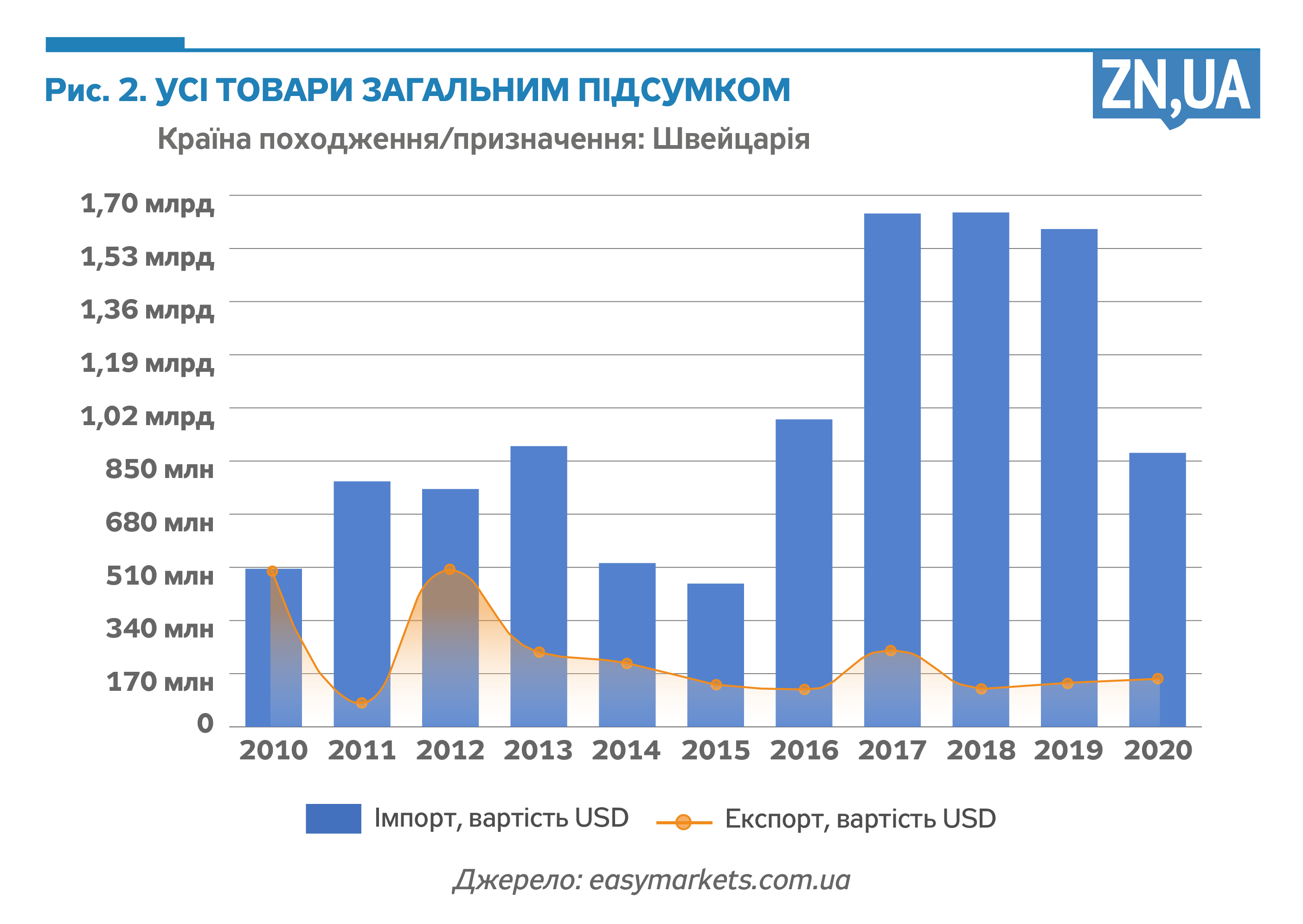 Звісно, є в України і справжня торгівля зі швейцарцями, але вона мізерна, реальних товарів ми туди поставили 2020-го лише на 142 млн дол., і це ще був непоганий рік (див. рис. 2). Решта — виключно маніпуляції наших експортерів, які що є сили намагаються недоплатити податків тут, в Україні.