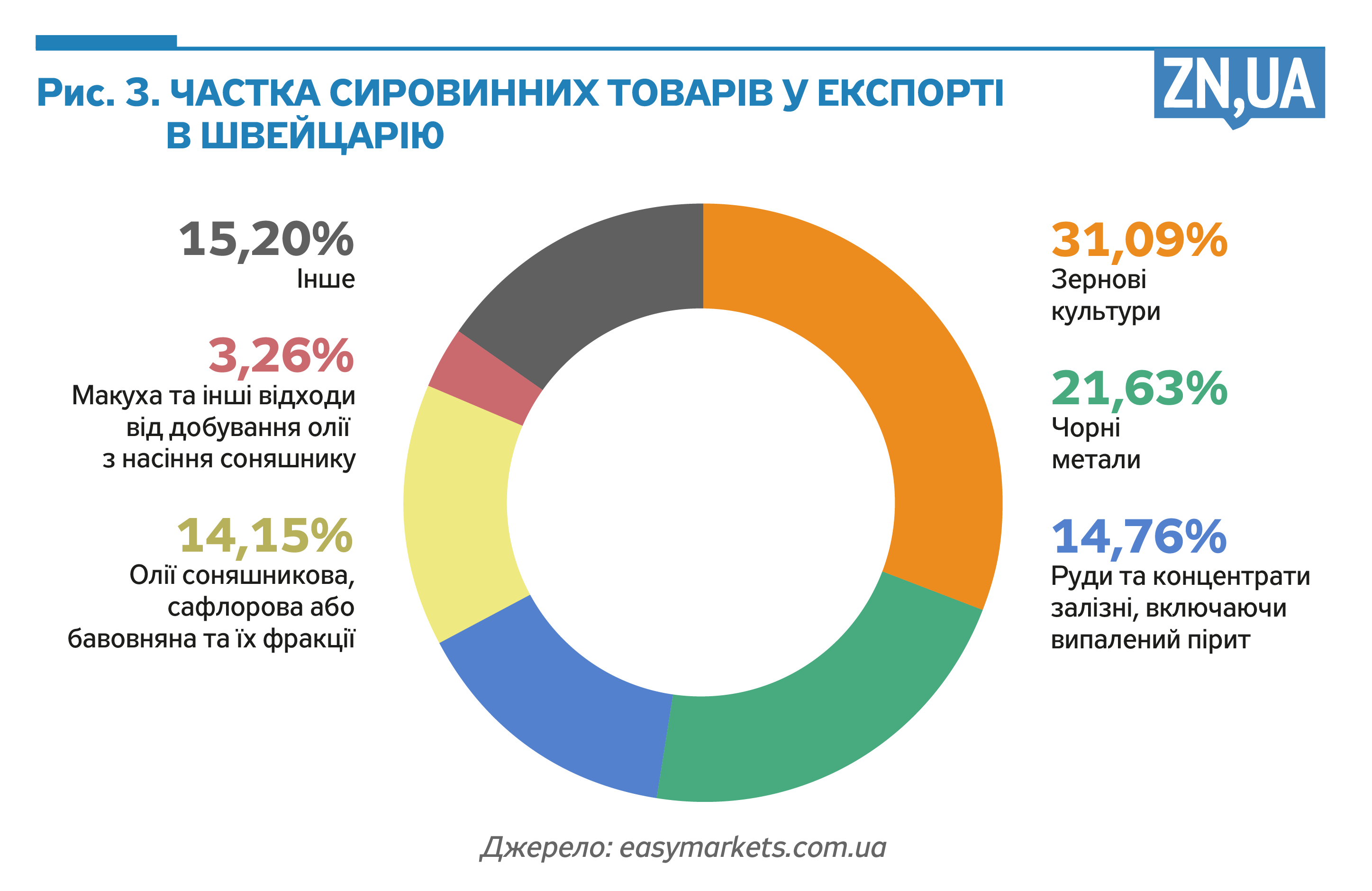 Зі згаданих 18 млрд дол. 15 млрд було сплачено за зернові, чорні метали, залізні руди, соняшникову олію та шрот. 60% усіх зернових і 61% усієї залізної руди продавалися через Швейцарію. Загалом 85% товарів — виключно сировина (див. рис. 3), виробники та постачальники якої так полюбляють розказувати про свій неоціненний внесок у наш економічний розвиток, забезпечення збільшення кількості робочих місць, зростання ВВП, валютну виручку й оце все. Вони хочуть, щоб їх називали не олігархами, а інвесторами. Але чому ж тоді ці «інвестори» всю виручку прокручують через Швейцарію?