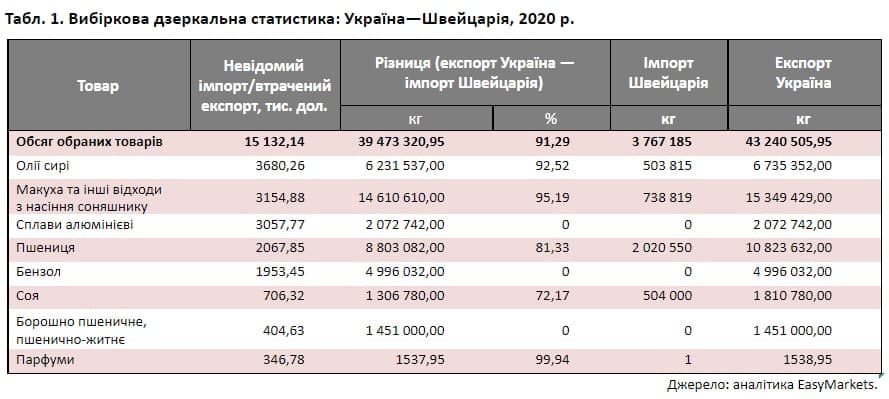 І, попри те, що контролюючі органи не надто переймаються ані обсягами перевірок, ані їхньою результативністю, перевіряти є що. Так звана дзеркальна статистика, співставлення митних даних країн — торговельних партнерів, змушує замислитися. Звісно, певні розбіжності у даних можуть бути наслідком різних методологій у країнах, логістичних лагів тощо. Тому не можна однозначно стверджувати, що саме тіньові схеми — причина всіх розбіжностей. Але якщо йдеться про масштабні провали у даних, то без «тіні» точно не обійшлося. І якщо подивитися навіть на вибіркову дзеркальну статистику нашої сировинної торгівлі зі Швейцарією, то з’ясується, що 2020-го, наприклад, з України до Швейцарії «виїхало» 43 тис. тонн продукції, з яких до Швейцарії «доїхало» 3,7 тис., а «загубилося» дорогою 39 тис. тонн продукції на суму 15 млн дол. (див. табл. 1).