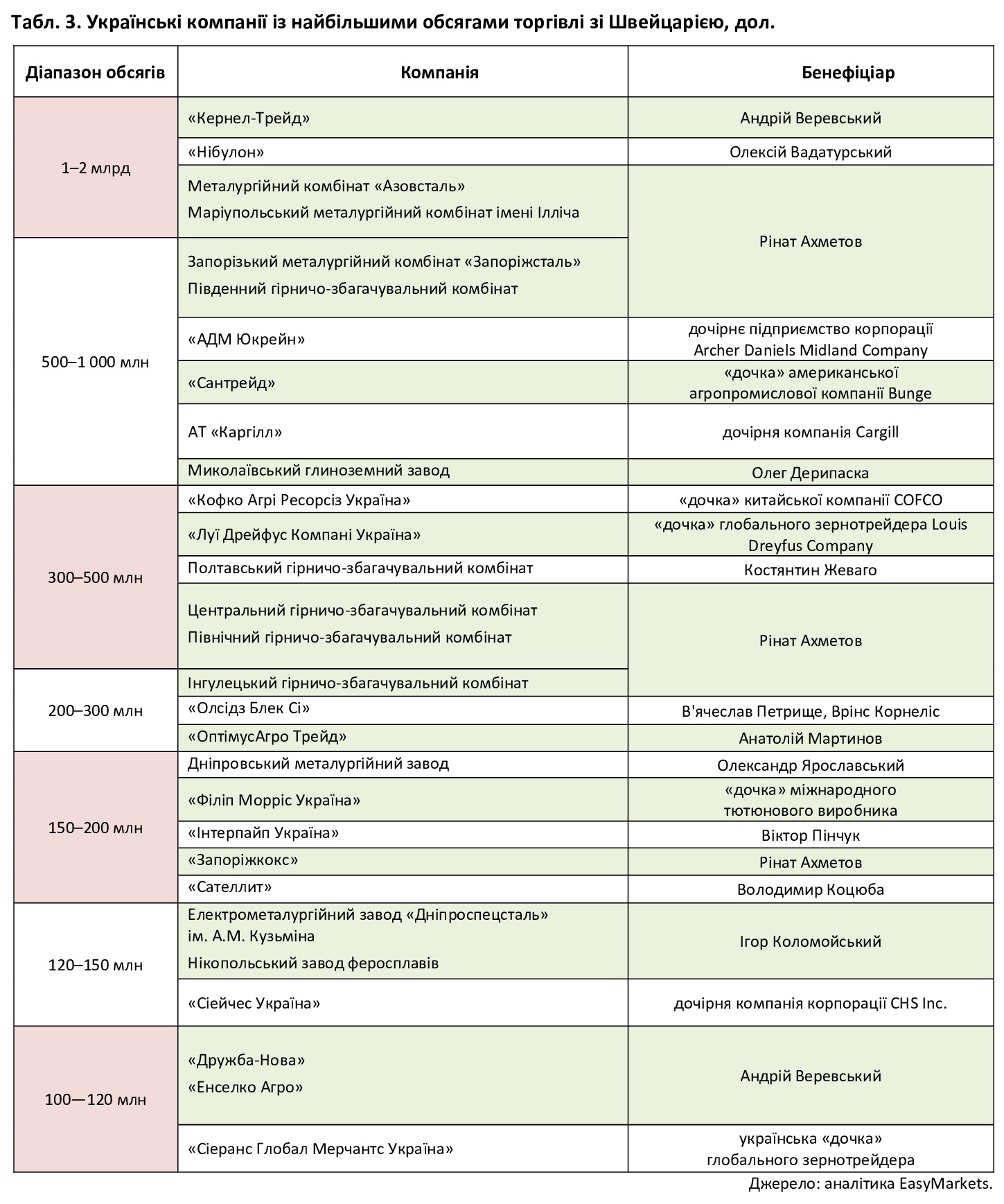 Наведений перелік не вичерпний — це лише верхівка айсберга, бо насправді українських компаній, які торгують зі Швейцарією принаймні на мільйони доларів, більш як чотири сотні. Ми просто виокремили найбільшу за обсягами тридцятку, в якій, як бачите, є і олігархи, що вважають за краще, аби їх називали інвесторами, і українські «дочки» глобальних трейдерів — теж «інвесторів» у лапках.
