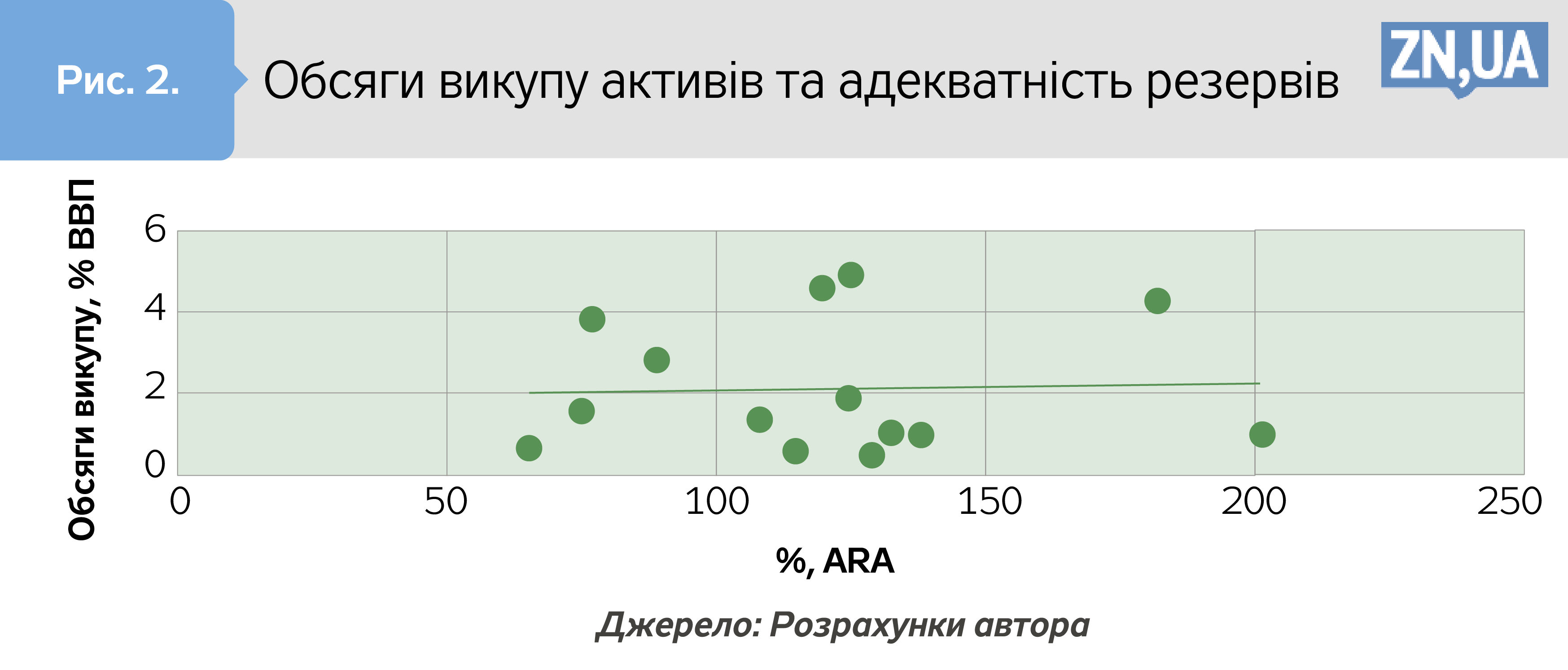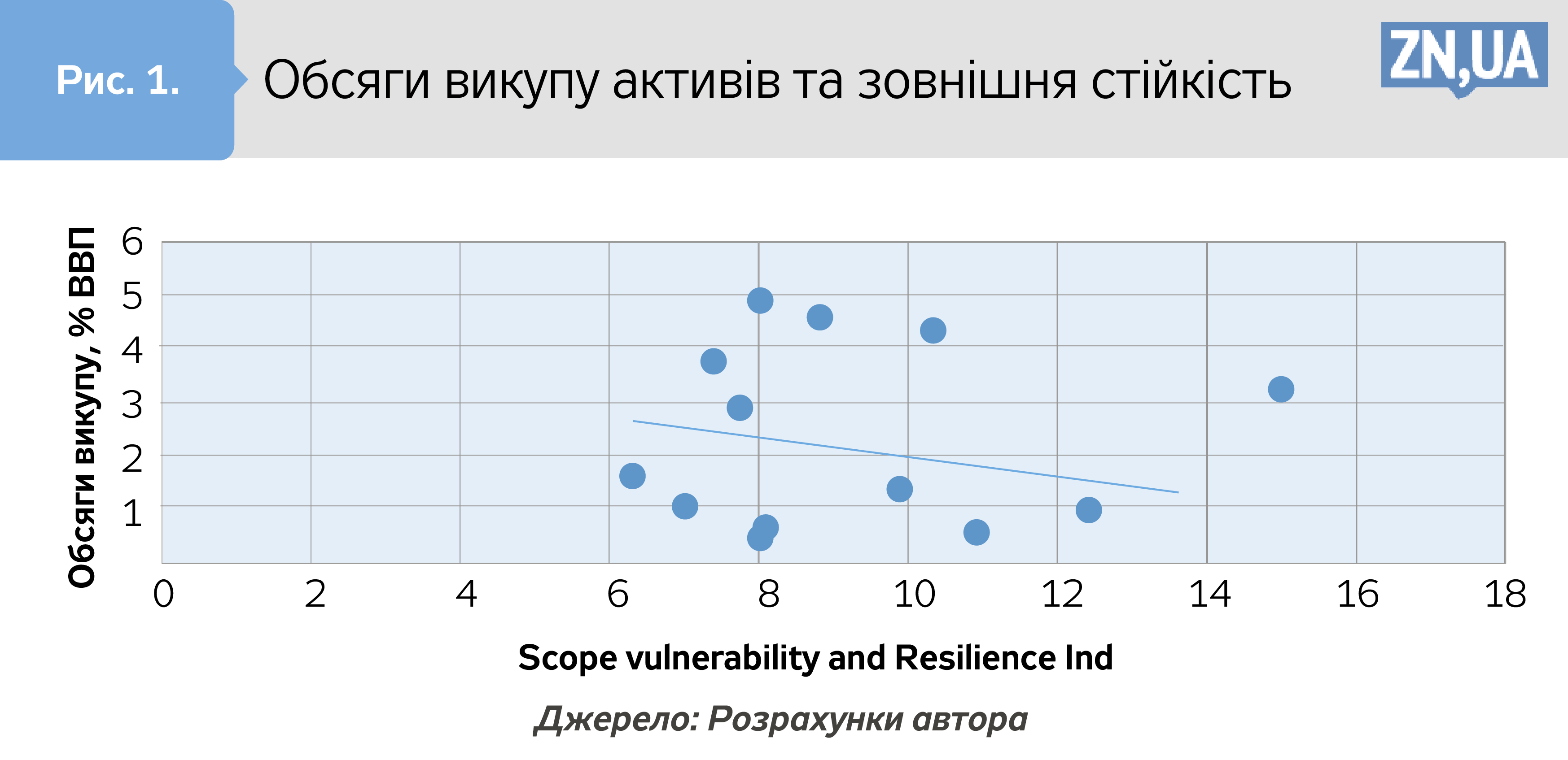 Так, рис. 1 демонструє, що зв’язку між обсягами викупу та індикатором зовнішньої стійкості не існує, а напрям зв’язку суперечить інтуїції. Логічно припустити, що у випадку, коли монетарні органи переймаються зовнішньою стійкістю, а її стан відомий економічним агентам, здійснювати викуп активів ризиковано з міркувань підвищення тиску на обмінний курс і валютні резерви. Але рис. 1 вказує на інше. Найбільші обсяги викупу мали місце в країнах з не найкращою зовнішньою стійкістю. Однак, що не менш важливо, до країн, які здійснювали викуп активів, але перебували в зоні ризику зовнішньої стійкості, входить лише Туреччина (значення індикатора зовнішньої стійкості — 8,3; а, для прикладу, України — 8,5). Результати дій Банку Туреччини навряд чи можна назвати такими, що стабілізували обмінний курс і загальну макроекономічну ситуацію.