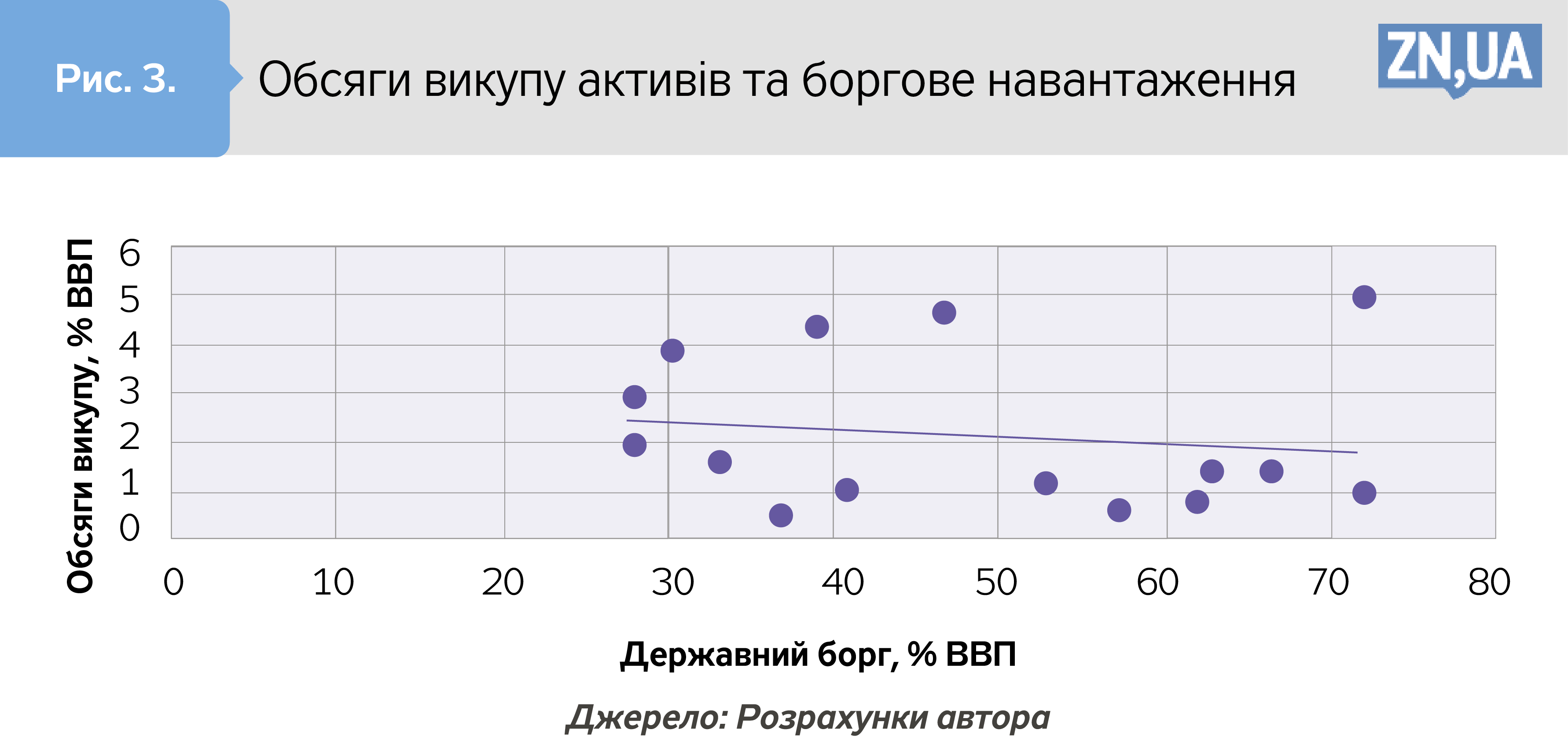 Утім, чи не найбільшою проблемою для аргументів і заперечень з приводу активації програм викупу активів у країнах з ринками, що формуються, є цілковита відносність критеріїв, які могли б дати відповідь на питання, за яких умов центробанки вдаються до цього без відверто негативних наслідків. Тобто значення показників, з якими можна теоретично струнко ув’язати масштаби викупу зі стабілізуючими наслідками, однаково можуть зустрічатись і в країнах, де монетарні органи вдавалися до викупу, і де не вдавались. Водночас країни, де викуп мав місце, також не дають підстав вважати, що обсяги викупу визначаються якоюсь певною закономірністю. Для ілюстрації цього до вибірки включено країни (Колумбія, Чилі, Гана, Гватемала, Угорщина, Індія, Індонезія, Малайзія, Філіппіни, Польща, Румунія, ПАР, Таїланд, Туреччина), центробанки яких підтримали вторинний ринок і по яких МВФ (див. посилання вище) наводить відповідні обсяги операцій. На рис. 1–4 показано відсутність зв’язків між обсягами викупу та індикаторами, що могли б їх теоретично коректно пояснити.
