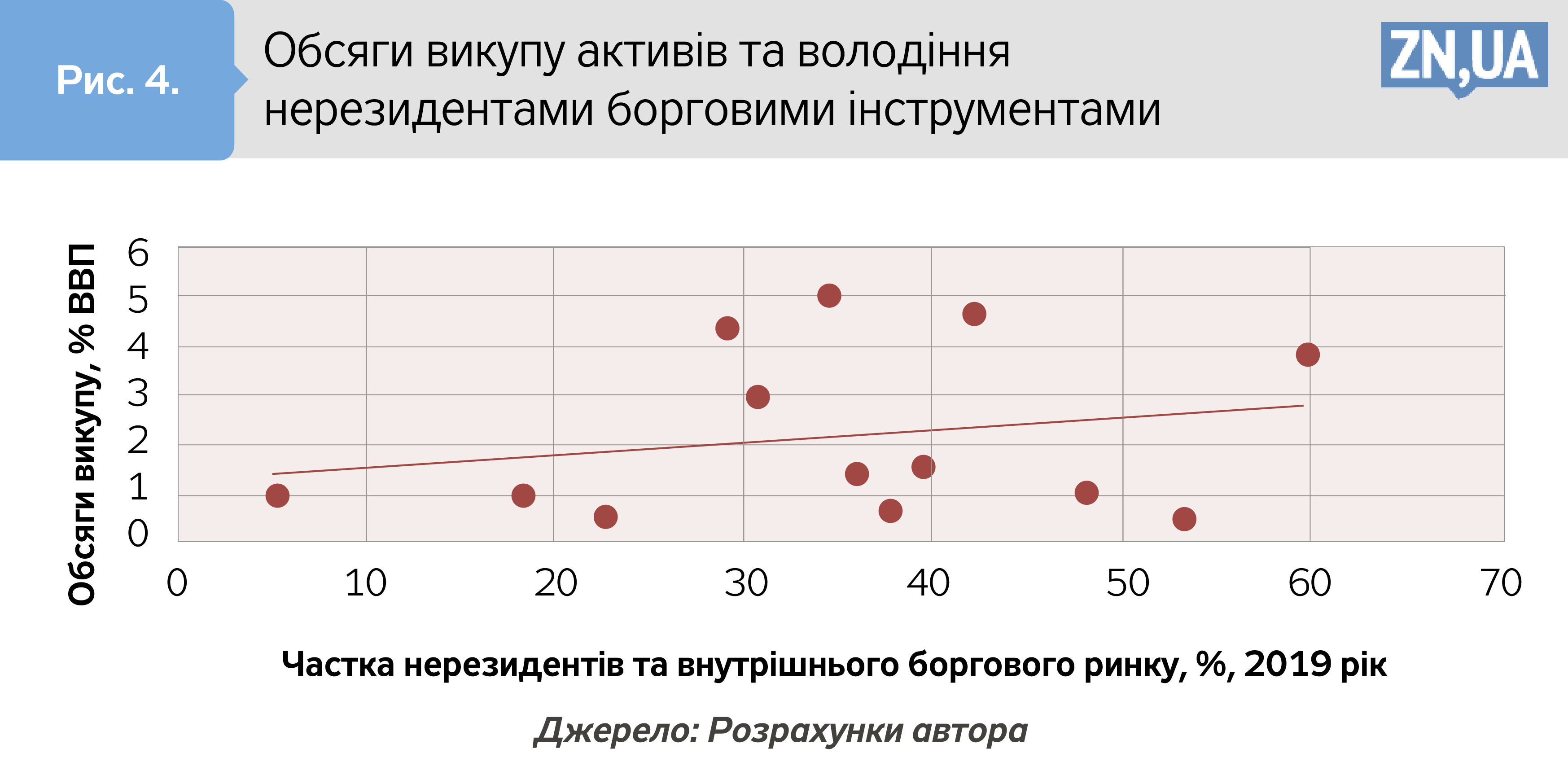 Частка нерезидентів на ринку внутрішнього боргу мала би визначити схильність центробанку до викупу активів, адже відплив капіталів був істотним фактором фінансового стресу. Аналогічно, протилежна позиція також актуальна. Більш значна присутність на ринку нерезидентів може справляти більший тиск на резерви у разі викупу активів під час втечі капіталу. На рис. 4. продемонстровано, що перший аргумент, швидше, був актуальнішим, хоча і він слабкий з огляду на низьку щільність зв’язку. Іншими словами, готовність «випустити» нерезидентів не могла не впиратися в розуміння наслідків для економіки з боку зниження резервів та обмінного курсу.