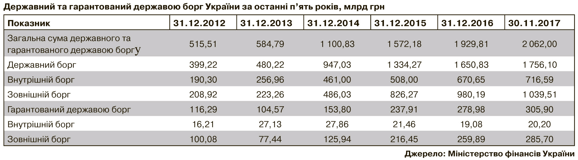 З 2014-го по 2016 р. держборг зріс утричі і до кінця 2016-го становив 1,65 трлн грн. Звичайно, у доларовому еквіваленті ця цифра не така страшна - 60 млрд дол., але ризиків це не скасовує. На кінець 2013-го боргові зобов'язання держави становили 32,8% ВВП, 2014-го - уже 59,7, до кінця 2015-го - 67,1, а за підсумками 2016-го - 69,3%. За оцінками Міжнародного рейтингового агентства Moody's, у 2018 р. держборг України буде на рівні 72,3% від ВВП. А загальний зовнішній борг становитиме 104,6% від ВВП. Потреба в запозиченнях у загальний фонд держбюджету у 2017–2019 рр. відповідно до прогнозних розрахунків Мінфіну становить близько 214,9 млрд грн 2018-го і 258,6 млрд - 2019-го.