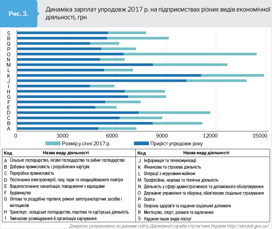 Упродовж 2017 р. найбільший номінальний приріст зарплат спостерігався у таких видах діяльності: державне управління та оборона; обов'язкове соціальне страхування (з 6420 грн у січні до 14442 грн у грудні, +8022 грн), професійна, наукова та технічна діяльність (з 8195 до 12682 грн, +4488 грн), постачання електроенергії, газу, пари та кондиційованого повітря (з 7343 до 11654 грн, +4311 грн), фінансова та страхова діяльність (з 11092 до 14899 грн, +3806 грн), інформація та телекомунікації (з 10210 до 13833 грн, +3623 грн). Ці самі види діяльності показали найбільший приріст і в першому кварталі 2018-го (за три місяці понад 1000 грн).