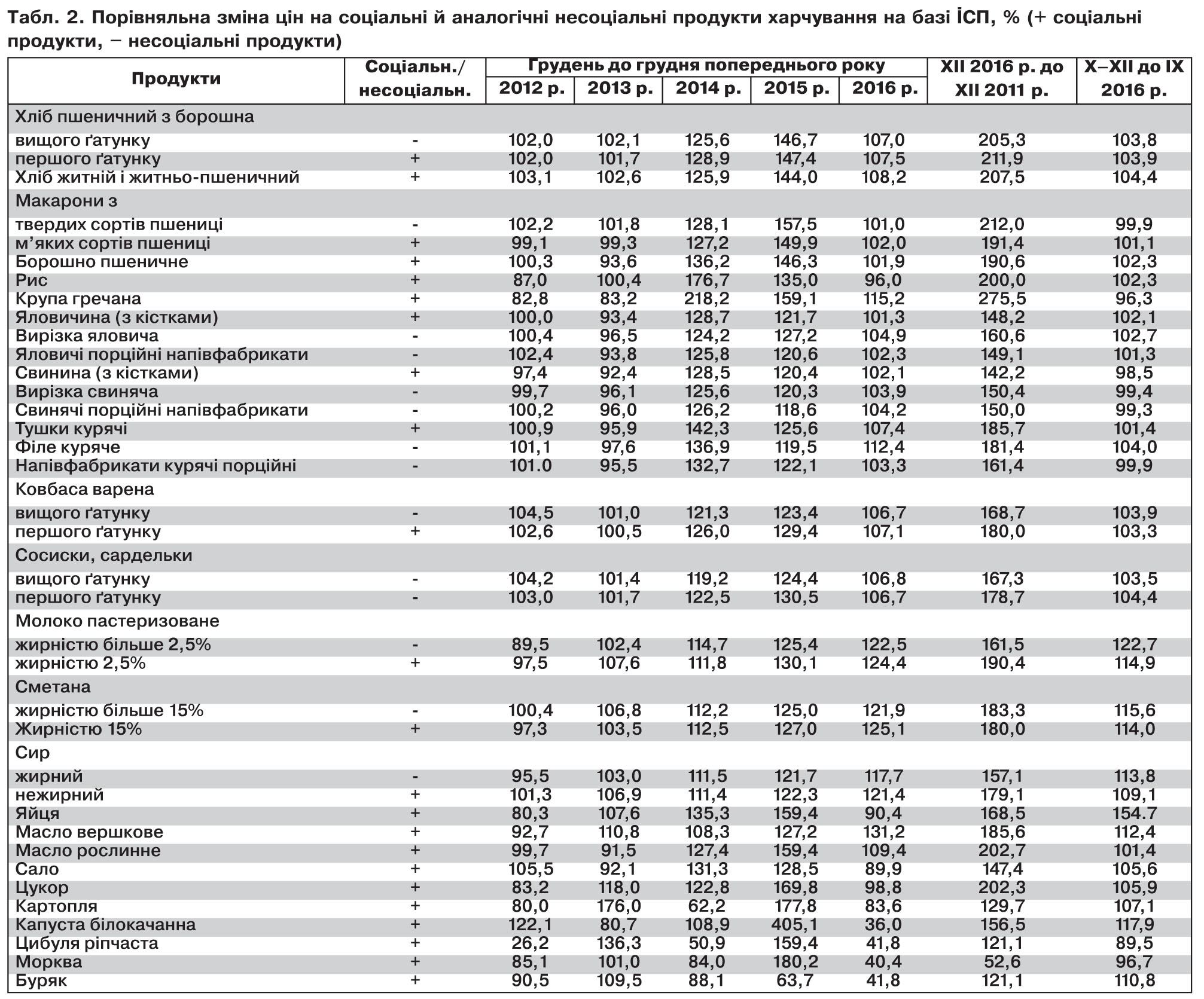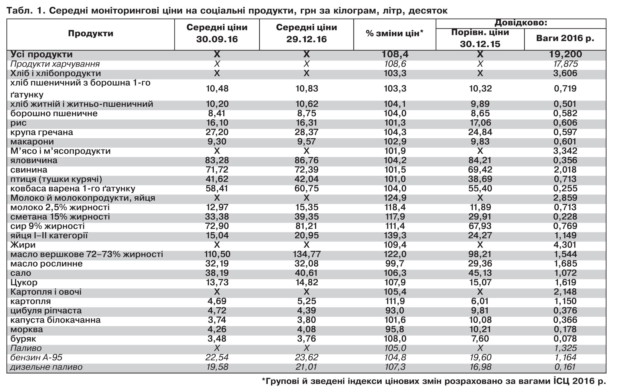 У табл. 1 наведено моніторингові ціни в середньому по Україні щодо всіх соціальних продуктів, а не тільки передбачених кабмінівською постановою, з додаванням цін на них на кінець 2015 р. (тобто фактично на початок 2016-го), а також для орієнтації - їхню вагу у 2016 р. у продуктовому наборі ІСЦ. А табл. 2 базується, як видається, на більш якісних і повних даних по тих же соціальних продуктах харчування за останні п'ять років і заключний квартал минулого року.