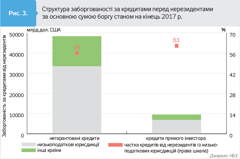 За даними НБУ, більш як третина від усіх прямих іноземних інвестицій (ПІІ), що надійшли в Україну станом на кінець 2017 р., походить із країн з низьким рівнем оподаткування, і майже 100% від ПІІ з України спрямовані до низькоподаткових юрисдикцій (див.рис. 1, 2 ).