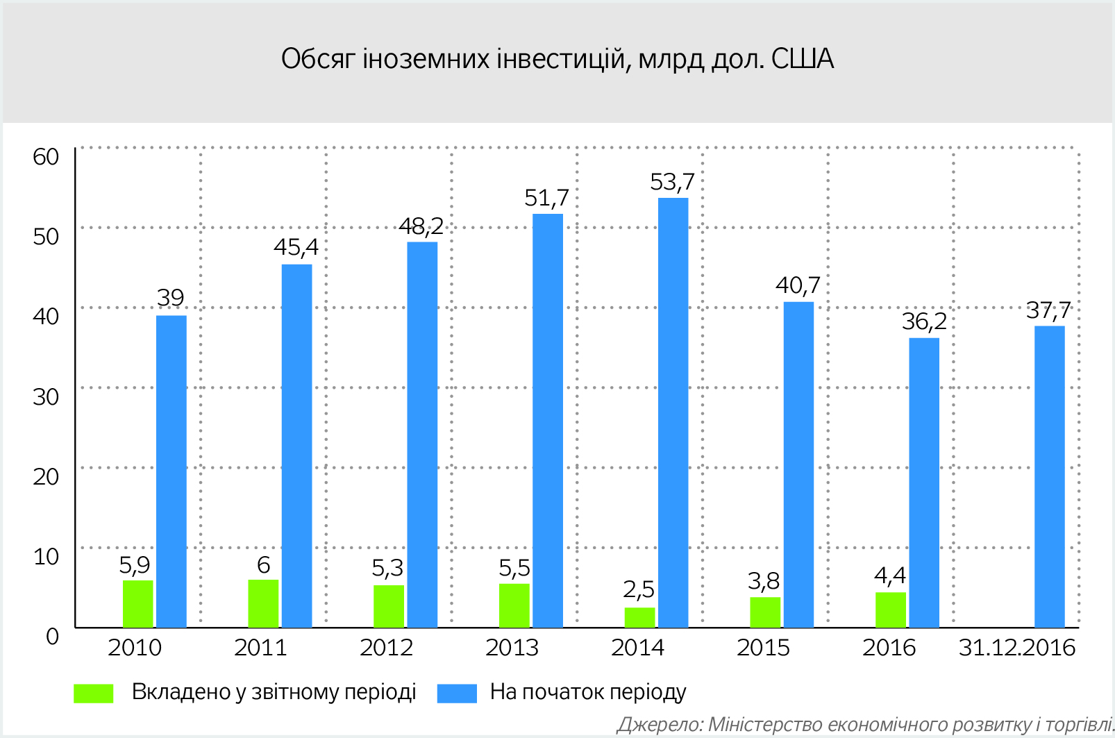 Іноземні капітальні інвестиції, які ми маємо сьогодні, становлять близько 3% загального обсягу всіх інвестицій і суттєво не впливають на розвиток економіки. Особливо враховуючи, що це по суті українські інвестиції за рахунок коштів, раніше виведених в офшори. А прямі іноземні інвестиції (ПІІ) також незначні. За офіційними даними Мінекономрозвитку, обсяг залучених з початку інвестування ПІІ (акціонерного капіталу) станом на 31 грудня 2016 р. становив 37,7 млрд дол. (див. рис. на сайті DT.UA).