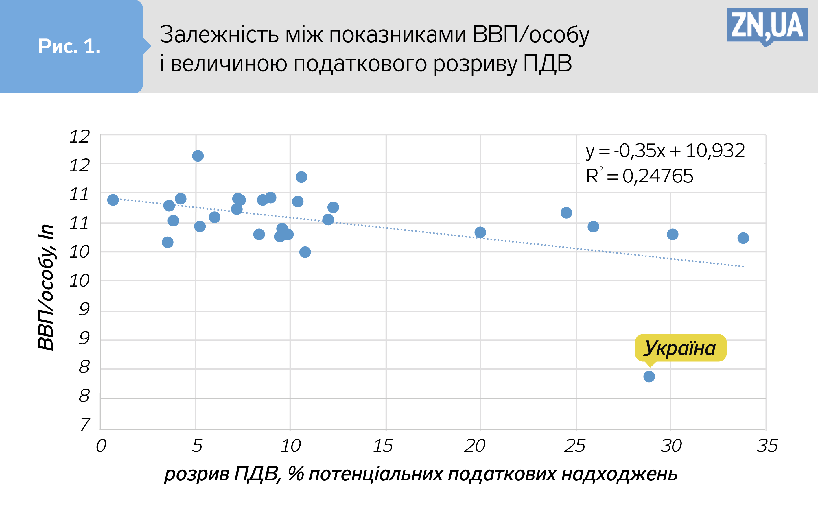 Цікавим є такий факт. Уже за нашими спостереженнями, величина податкового розриву у відносному вираженні має обернену залежність від величини середньодушового доходу в економіці. Тобто що менший цей дохід, то більший податковий розрив. Якщо до даних ЄС додати відповідні цифри по Україні, то побачимо отаку наочну картинку, що подана на рис. 1.