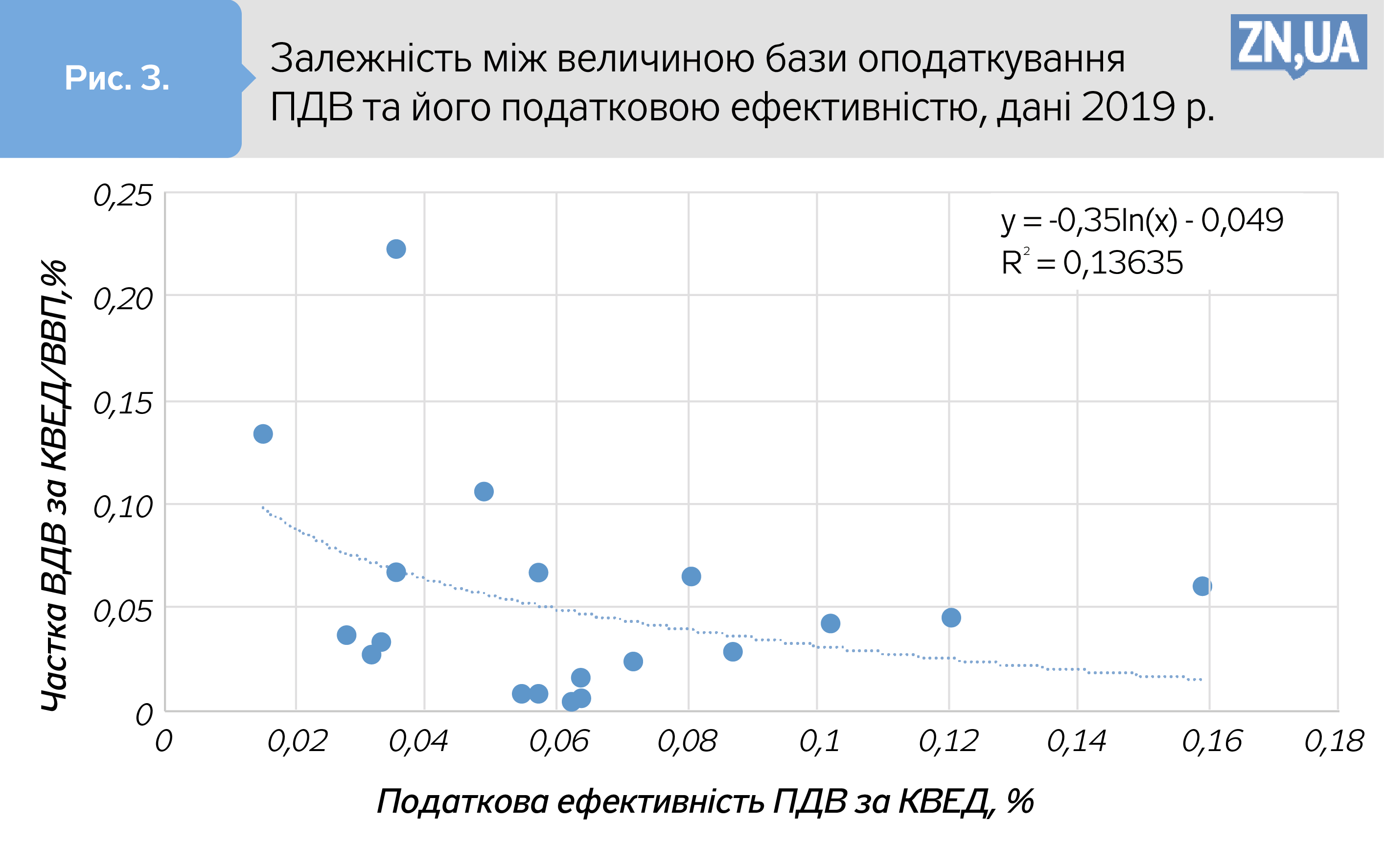 Те, що ПДВ — решето, засвідчують офіційні статистичні дані ДПС України, які слід тільки розглядати не в динаміці, а в порівнянні з іншими не менш офіційними показниками самої ДПС і Держстату. Згідно з цими даними, податкова ефективність ПДВ у розрізі галузей КВЕД змінюється в досить широкому діапазоні. Якщо середньозважений показник по економіці в цілому становить станом на третій квартал минулого року 3,18%, то максимальним є значення для галузі «державне управління» — 15,9%, а мінімальним — для «оптової та роздрібної торгівлі», дорівнюючи лише 1,5%. Але якщо порівняти ці показники з показниками бази оподаткування, тобто питомої ваги доданої вартості, створеної в кожній з галузей окремо, то ми бачимо зворотно пропорційну залежність між часткою бази оподаткування ПДВ у структурі економіки і фіскальною ефективністю податку. Іншими словами, що більша база оподаткування в кожній окремій галузі, то меншою є податкова ефективність ПДВ (див. рис. 3). Хіба це не дивно! Як на мене, такої високої диференціації податкової ефективності за галузями взагалі не має бути. Оскільки структура економіка — штука повільна для змін у коротко- і навіть середньостроковому періодах часу, то мушу вас запевнити, що 2020 року картина кардинально не змінилася, навіть попри незначний приріст фіскальної ефективності ПДВ.