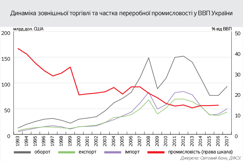 При цьому на експорт з України йдуть переважно сировина (зерно, залізна руда) і продукція первинної обробки (чорні метали, соняшникова олія), тоді як близько половини імпорту - готова продукція кінцевого споживання. Виходить, що вітчизняні виробники високотехнологічної продукції машинобудування, як і більшість виробників значно простіших благ (одяг, меблі, побутова техніка) не лише не одержали доступу до зарубіжних ринків, а й були витіснені з українського. Частка непродовольчих товарів вітчизняного виробництва на внутрішньому ринку України протягом 2005–2017 рр. зменшилася з 57,6 до 32,6%. Усе це розганяло й без того стрімкі процеси деіндустріалізації національної економіки, які набули загрозливих масштабів і засвідчили руйнацію значної частки колись потужного промислового потенціалу країни. Частка переробної промисловості у ВВП України з 1993 р. обвалилася з 41,1 до 14,2%.