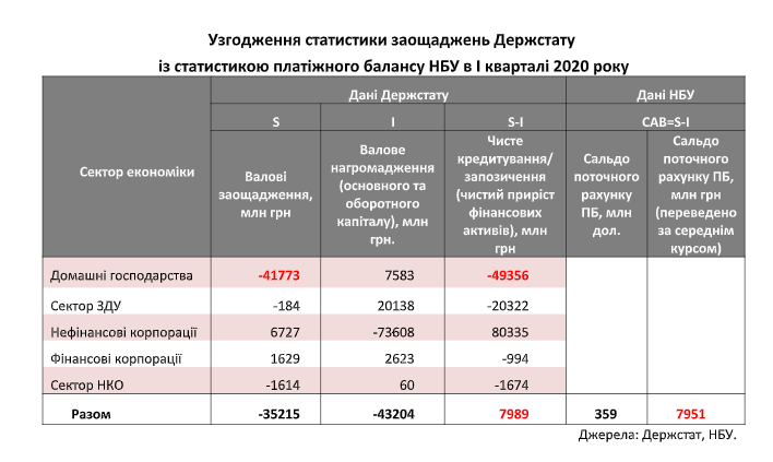 Від’ємне значення заощаджень економіки (-35,2 млрд грн) в основному було сформоване від’ємними заощадженнями населення (-41,8 млрд грн). Кошти від скорочення заощаджень населення переважно спрямовувалися на купівлю товарів і послуг (частка яких відносно отриманих доходів населення сягнула рекордних за всю історію України 92%). Ажіотажний попит на споживчі товари підбурювався розгортанням коронакризи. Внаслідок ажіотажного попиту на товари, а також частково внаслідок карантинних обмежень на імпорт відбулося безпрецедентне скорочення запасів оборотного капіталу в секторі нефінансових корпорацій (на 138 млрд грн). Скорочення інвестицій в оборотний капітал, зменшення запасів торгівлі в поєднанні із падінням інвестиційних настроїв призвели до того, що в секторі нефінансових корпорацій тимчасово сформувався надлишок ліквідності — чистий приріст фінансових активів у секторі нефінансових корпорацій за підсумками першого кварталу 2020 року становив понад 80,3 млрд грн. Це, в свою чергу, зумовило можливість формування додатного балансу між заощадженнями та інвестиціями в цілому на рівні економіки (+7,99 млрд грн), що знайшло своє відображення і в платіжному балансі НБУ (+7,95 млрд грн). Як бачимо, все чітко і логічно.
