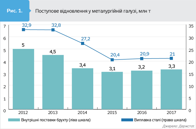А результати дійсно відчутні (рис. 1). По-перше, другий рік поспіль зберігається позитивна динаміка поставок металобрухту внутрішньої заготівлі на вітчизняні підприємства металургійної галузі, завдяки чому його дефіцит протягом 2016–2017 рр. знизився майже втричі - з 850 тис. до 300 тис. т. По-друге, позитивна динаміка спостерігається також в обсягах виплавки сталі, які у зазначений період зросли з 20,4 млн до 21,0 млн т, незважаючи на інші проблеми підприємств галузі, зокрема піврічний простій Дніпровського металургійного комбінату через перебої в поставках коксівного вугілля. По-третє, активізувалося переробне виробництво вздовж ланцюга створення вартості. Так, у перший рік дії експортного мита на брухт у 30 євро/т трубними комбінатами, які споживають сталь з металургійних підприємств, виготовлено на 17,4% більше труб, ніж роком раніше. З них безшовні труби, у виробництві яких частка брухту в сировині сягає 90%, показали зростання на 29% - з 386 тис. до 496 тис. т. Вітчизняне виробництво металоконструкцій, в якому використовуються труби та металопрокат, у січні-вересні 2017 р. порівняно з аналогічним періодом 2016 р. зросло на 8,9% - з 55,0 тис. до 55,9 тис. т.