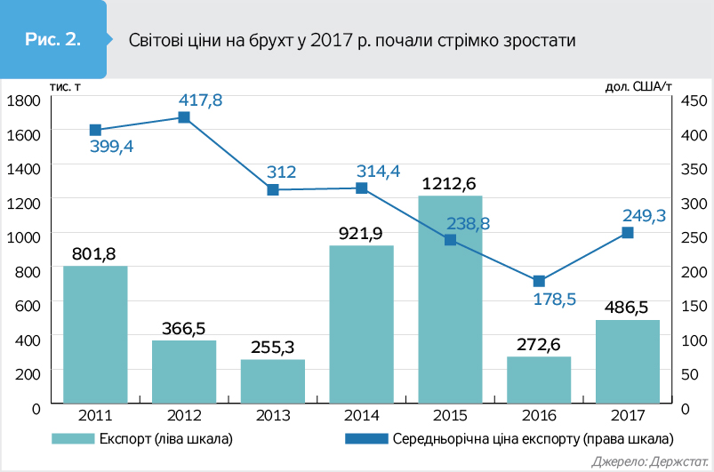 Як наслідок, не забарилося й зростання обсягів експорту брухту. У 2017 р. він зріс на 78,5% - з 272,6 тис. до 486,5 тис. т. За даними Держстату, експортні ціни на брухт у січні 2018 р. наблизилися до позначки в 300 дол./т, а "Укрметалургпром" зафіксував збільшення експорту брухту чорних металів у січні-лютому 2018 р. у 4,8 разу до аналогічного періоду попереднього року.