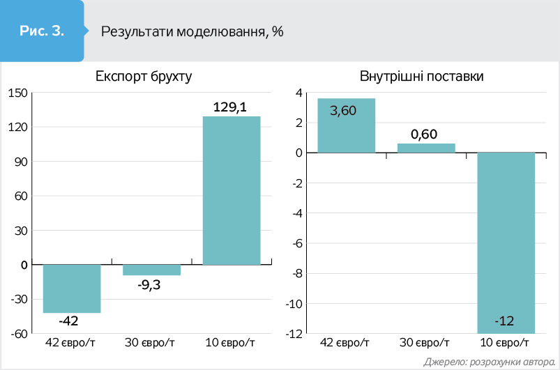 У разі повернення до вивізного мита на рівні 10 євро/т при наявному тренді експортних цін зростання обсягів внутрішньої заготівлі брухту очікується на рівні 6,0%, тоді як його експорт збільшиться на 129,1%. Як наслідок, внутрішні поставки скоротяться на 12,0% (до 2,91 млн т), у зв'язку з чим дефіцит брухту чорних металів сягне 19,4%. Недопоставки брухту для вітчизняних підприємств металургійної і машинобудівної галузей призведуть до скорочення ВВП України на 0,06 в.п.
