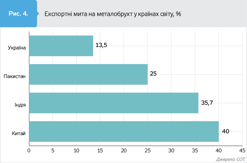 А тут навіть побіжний аналіз засвідчує, що такий підхід з боку України цілком відповідає міжнародній практиці обмеження експорту металобрухту в багатьох країнах світу з розвинутим сектором чорної металургії. У Китаї діє адвалерне експортне мито на рівні 40%, в Індії ставка мита (15%) у поєднанні зі спеціальним експортним податком сягає 35,7%, у Пакистані вивізне мито на брухт становить 25%. Це не кажучи вже про те, що в низці країн (зокрема, в Казахстані) діє повна заборона на експорт металобрухту.