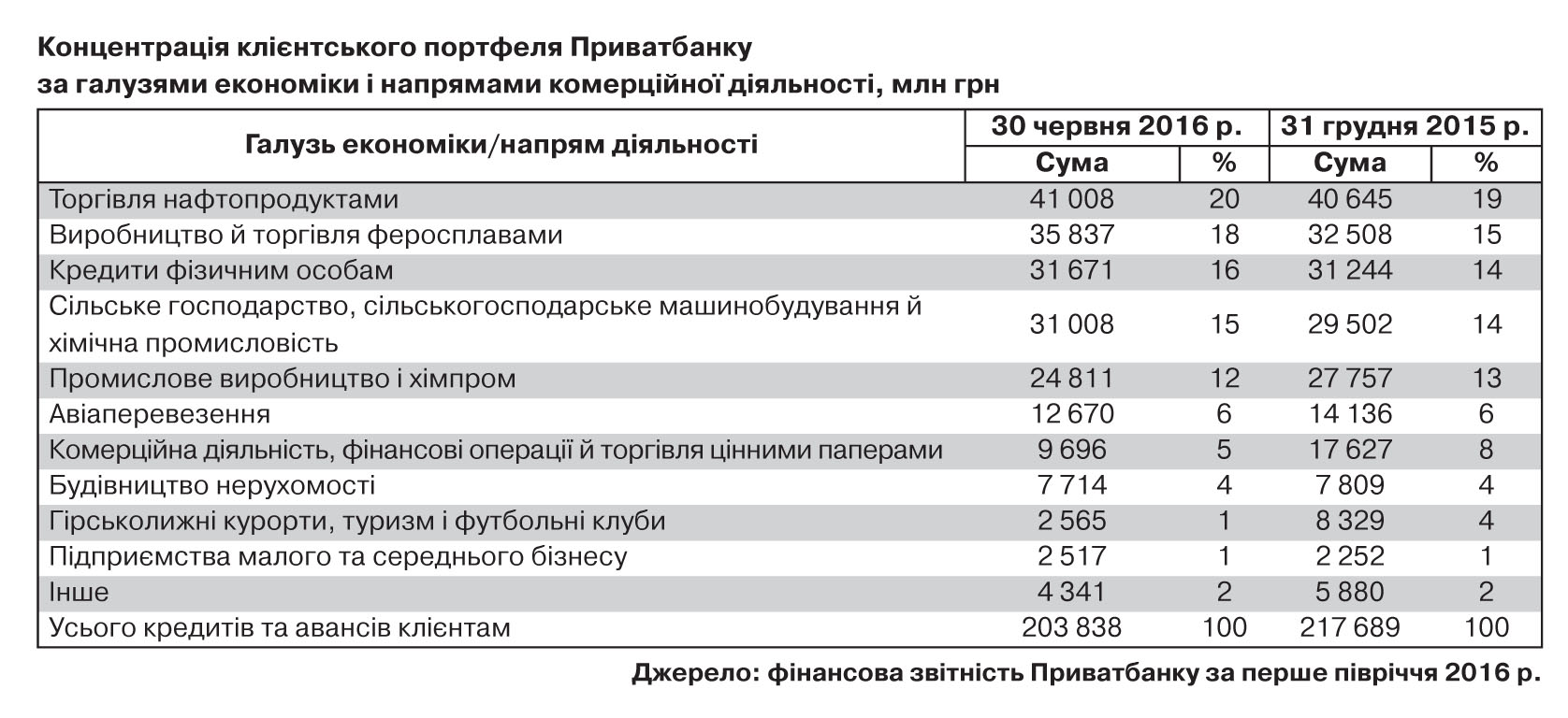 Наприкінці листопада Fitch Ratings підтвердило довгостроковий кредитний рейтинг Приватбанку в іноземній валюті на рівні "ССС", який характеризується "дуже високими кредитними ризиками". У супровідному огляді зазначається, що на кінець першої половини 2016-го кредитування пов'язаних сторін (згідно з МСФЗ) перебувало на високому рівні у 19% кредитів (або 109% основного капіталу за методологією Fitch). Але ця оцінка супроводжується застереженням, що ці цифри можуть не повністю відображати всі ризики за афілійованими структурами "з урахуванням обмежень у розкритті бенефіціарних прав власності в Україні". Неможливістю (або небажанням) довести наявність "родинних зв'язків" у хитросплетінні неформально приватівської ФПГ, очевидно, і пояснюються настільки великі різночитання в оцінках обсягів інсайдерського кредитування в банку. Від офіційно публікованих 20–25% до популярної на ринку оцінки, що на пов'язані структури припадає 80% приватівського кредитного портфеля, ще 15–16% - на роздріб і тільки 4–5% роздані "у ринок".