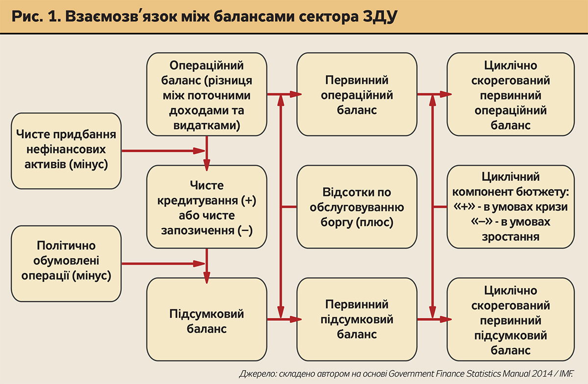 Для розв'язання проблем стабілізації економіки за підтримки МВФ та інших міжнародних організацій здійснюється розробка комплексних заходів фіскальної, монетарної та структурної політки в рамках програм кредитного фінансування. Задля здійснення якісної діагностики державних фінансів МВФ розробляє та постійно вдосконалює методичні підходи до обліку та звітності показників сектора загального державного управління (ЗДУ - включає державний бюджет, місцеві бюджети та позабюджетні фонди соціального страхування). Операції сектора ЗДУ на тих чи інших етапах бюджетного процесу зводяться до ряду взаємопов'язаних балансів - операційного (характеризує збалансованість поточних операцій) і підсумкового (враховує інвестиційні видатки, надання урядом політично обумовлених позик та приватизаційні процеси і, таким чином, відображає чистий вклад держави у формування сукупного попиту економіки).