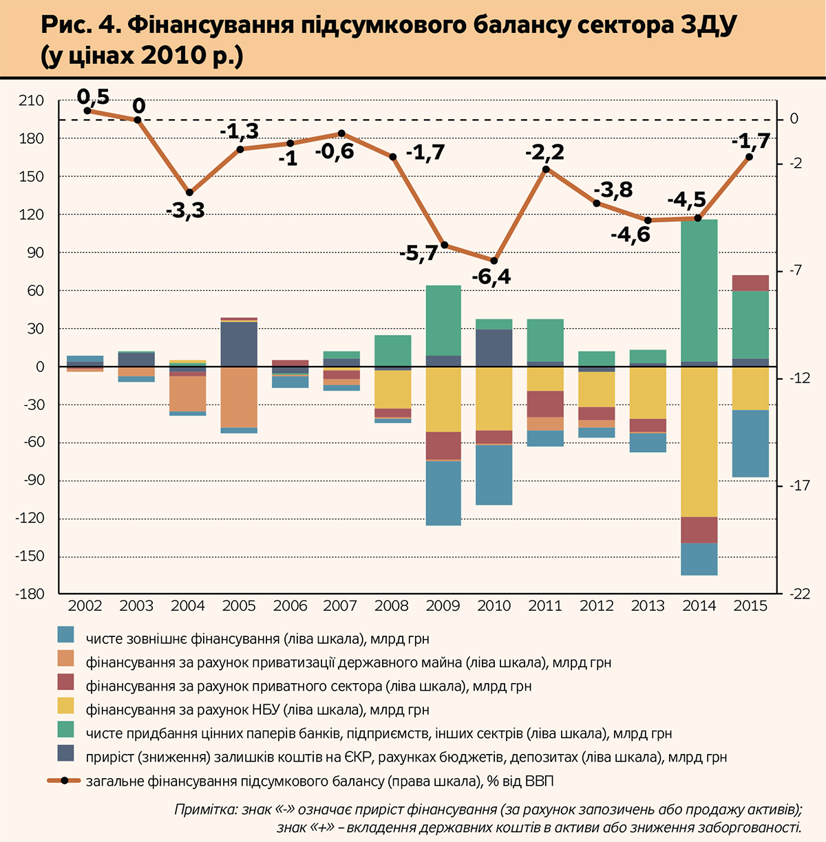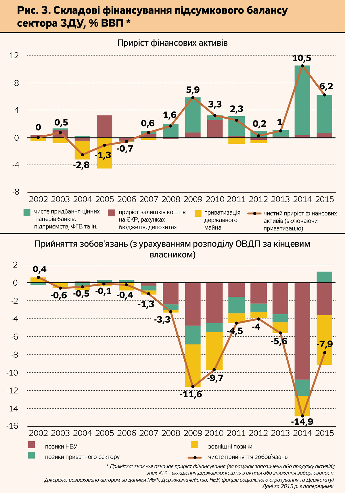 Як бачимо, 2009-й, 2014-й і 2015 р. входять до трійки років з найбільшими обсягами трансакцій в рахунках фінансування дефіциту сектора ЗДУ. Так, сумарний вартісний обсяг трансакцій з придбання фінансових активів і набуття зобов'язань у порівняних цінах становив: у 2009 р. - 17,6% ВВП; у 2014 р. - 26,3% ВВП; у 2015 р. - 16,7% ВВП.