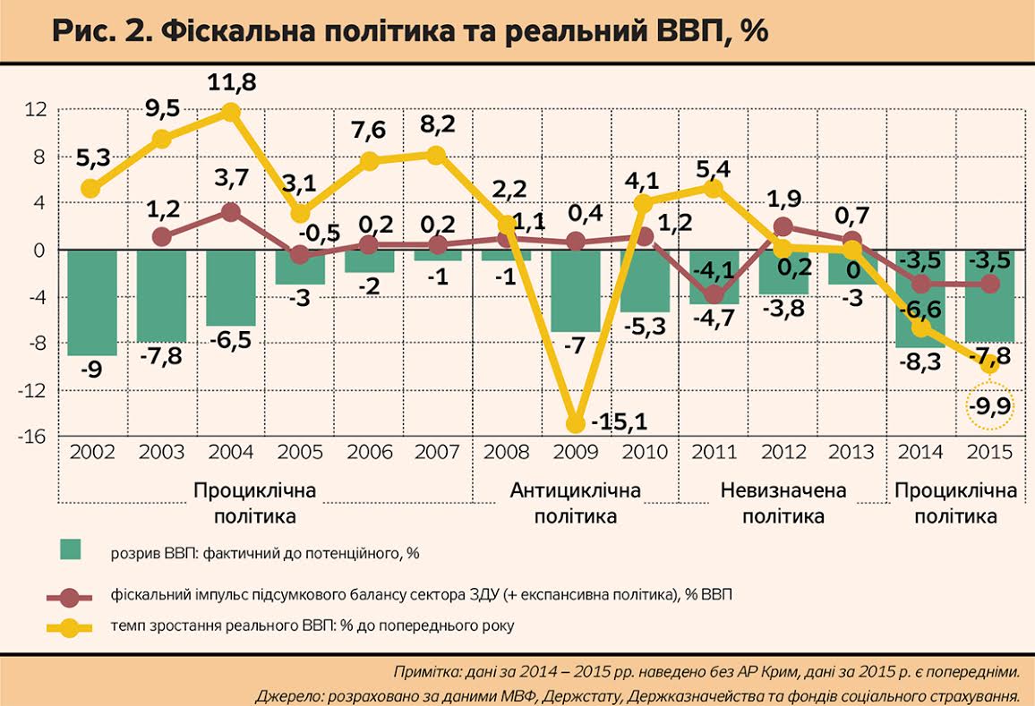 - реалізація фіскальної політики у 2014–2015 рр. певною мірою подібна до ситуації 2011-го. Так, в умовах 15-відсоткового падіння реального ВВП (за 2014–2015 рр.) фіскальний імпульс є від'ємним: по -3,5% ВВП кожного року. Таку політику можна назвати навіть не проциклічною, а мультициклічною, оскільки вона провокує прогресивне скорочення і так низького внутрішнього попиту та є чинником зубожіння верств населення, залежних від державних виплат. Здійснення такої політики в подальшому негативно впливатиме на тривалість макроекономічної стабілізації та можливість забезпечення стійких темпів економічного зростання у майбутньому.