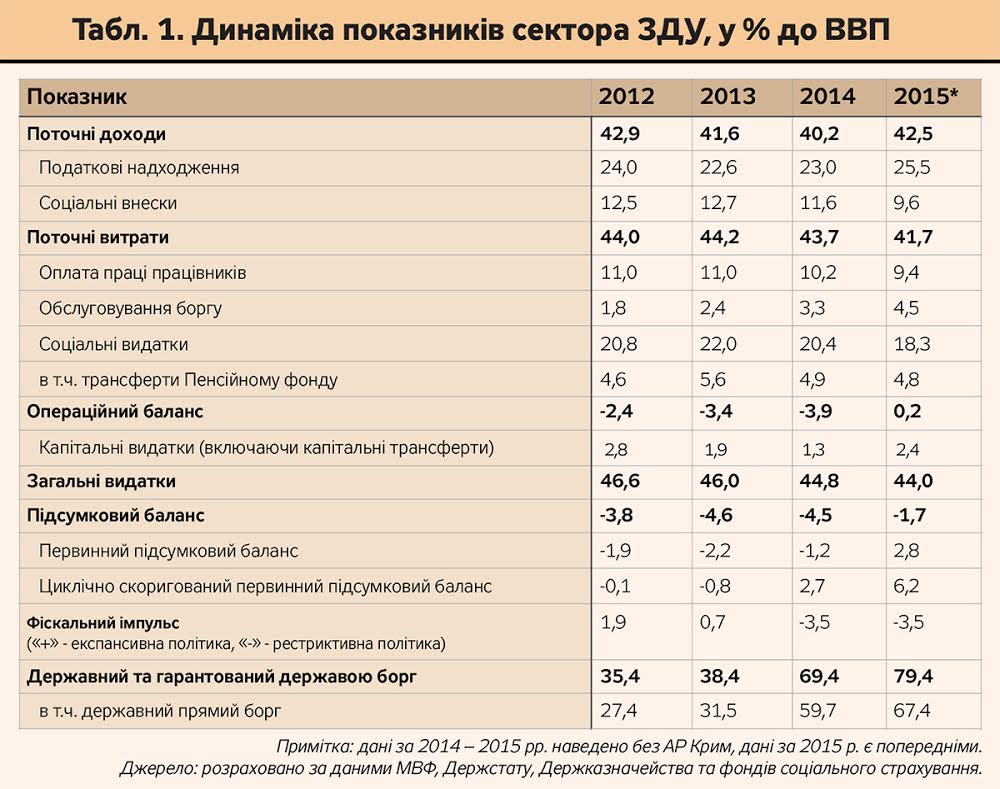 Слід зазначити, що профіцитний баланс держфінансів України 2015 р. став нетиповим винятком із загальної картини їх стану. Так, упродовж попередніх шести років спостерігався перманентний дефіцит балансу операційних доходів і витрат сектора ЗДУ (в середньому -3,5% ВВП), що призводило до постійного тиску на обсяг необхідних запозичень. Навіть вимушене згортання інвестиційної активності держави не дозволило виправити ситуацію. Левова частка запозичень здійснювалася в іноземній валюті або з прив'язкою до обмінного курсу гривні, що в умовах девальвації спричинило підвищення рівня боргового навантаження на економіку.