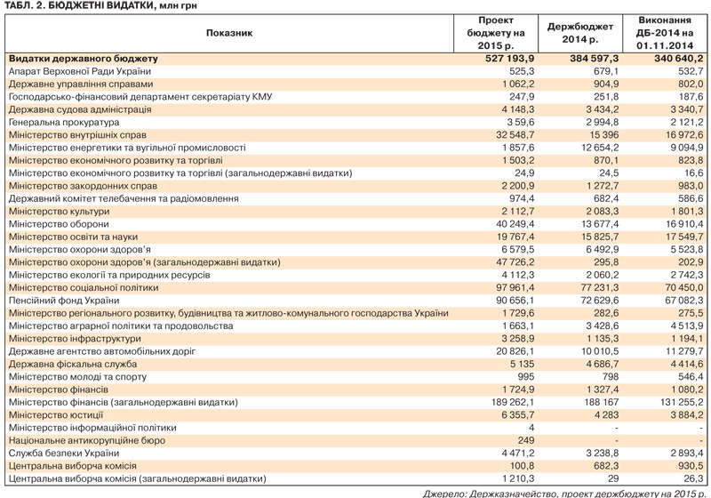 Проект держбюджету підтвердив усі найпесимістичніші очікування: у нього закладено практично нездійсненні за умов стрімко скорочуваної економіки показники. Доходи державного бюджету на 2015 р. Кабмін планує встановити на рівні 475,2 млрд грн, видатки - 527,1 млрд. ВВП 2015-го, за оптимістичним сценарієм Кабміну, знизиться на 2%, а за консервативним - на 4,3%. Песимістичного сценарію в уряду все ще немає, але він є в міжнародних експертів. У день подачі проекту бюджету до парламенту Міжнародне рейтингове агентство Moody's озвучило прогноз падіння ВВП в Україні у 2014 р. на 7,5%, а 2015-го - на 6%.
