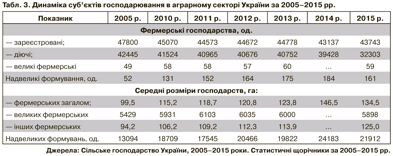 Потенціал фермерських господарств щодо молочного скотарства не використовується й на десяту частину: при кількості 32,3 тис. од. із середньою площею сільськогосподарських угідь 134,5 га вони утримували в 2015 р. 106,1 тис. голів ВРХ, у тому числі 41,7 тис. корів, або по 3,3 та 1,3 голови в розрахунку на одне господарство, нічим не відрізняючись у цьому сенсі від звичайних домогосподарств населення. Проте цей парадокс стає зрозумілим, коли зважити на те, що за декларативної "рівності всіх форм господарювання" чомусь саме кількість вітчизняних фермерських господарств скорочується, хоча вона в кілька разів менша, ніж у країнах, де сільськогосподарське виробництво розвивається більш гармонійно.