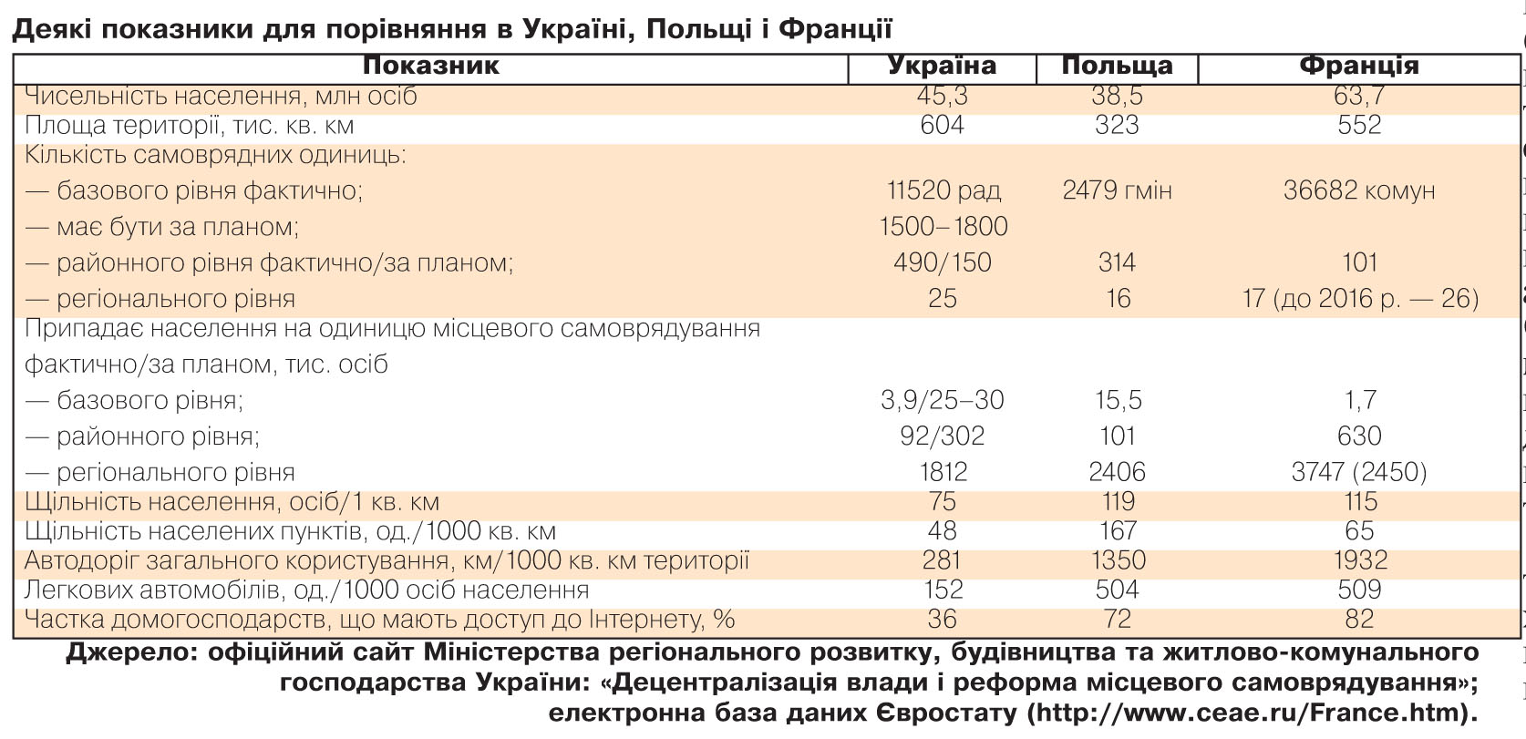 З наведених у таблиці даних видно, що нинішня кількість населення самоврядних одиниць базового рівня в Україні більша, ніж у Франції (майже вдвічі), проте в чотири рази менша, ніж у Польщі. Після реформування згідно з планом українські ОТГ перевищать за чисельністю і польські гміни, і тим більше французькі комуни.