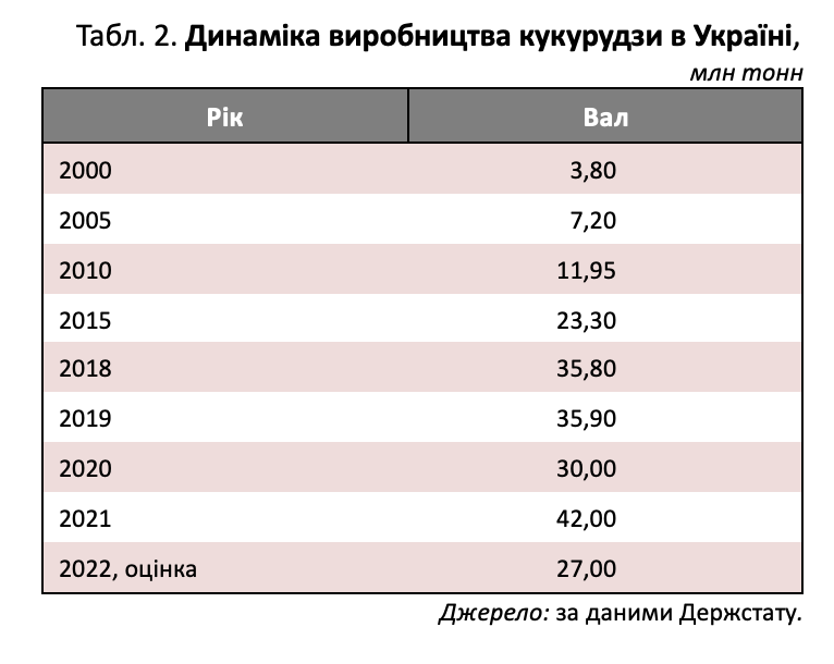 Аграрії України зібрали станом на 20 січня 2023 року 24 млн тонн кукурудзи. Обмолотили 3,7 млн га. Отож іще 13% площ продовжують зимувати. Те, що зібрали, вивозимо. Експортували майже за сім місяців сезону більш як 14 млн тонн. (Частина — врожай-2021, бо кілька місяців експорт був заблокований.)