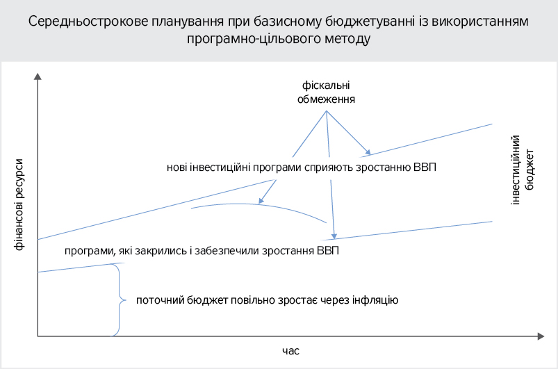 Середньострокове бюджетне планування є обов'язковою умовою при базисному (англ. - incremental) бюджетуванні, приймаючи базис як необхідне зло. Суть середньострокового планування за таких обставин полягає в інвестуванні ресурсів, які можна виокремити з існуючого базису, на певні установи, заходи або програми (дивлячись, як саме побудоване планування). Але ці інвестиції, з одного боку, мають забезпечувати розвиток згідно з державною стратегією, а з іншого - не перетворитися на базис, який потребує постійного вливання бюджетних коштів. Такі видатки обов'язково повинні закінчуватись і давати результат, який не обтяжує, а в кращому разі прямо наповнює бюджети. За найефективнішого бюджетування частка базису у ВВП та у видатках бюджету має скорочуватися.