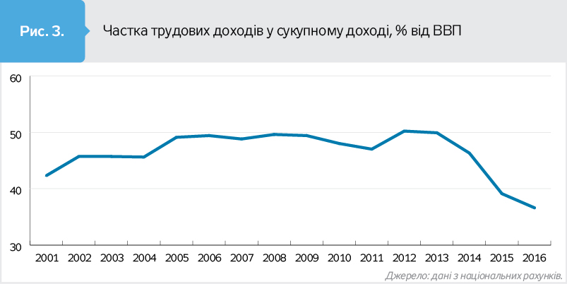Наостанок експерти радять Україні звернути увагу на проблему справедливого розподілу дивідендів від економічного зростання у суспільстві. Йдеться про так звану інклюзивність економіки, якої поточна модель розвитку не забезпечує. Глибокий спад економіки, який пережила наша країна відразу після Революції гідності, знецінення валюти та зменшення поточних видатків держави призвели до суттєвого зменшення наявних доходів у певних категорій населення. Через це частка трудових доходів у сукупному доході в Україні різко скоротилася (див. рис. 3).