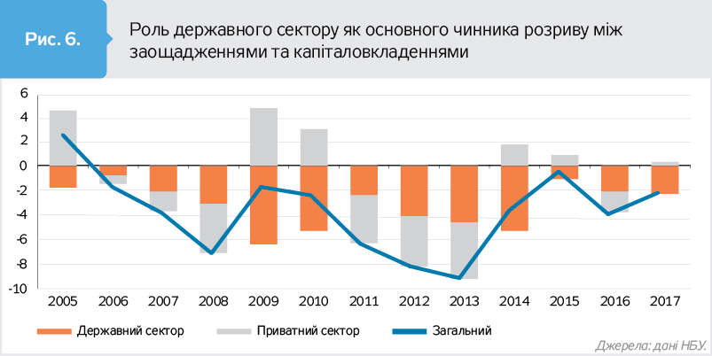 Ускладнюють ситуацію великі дисбаланси у державному секторі, які залишаються головними чинниками утворення в Україні розриву між заощадженнями та капіталовкладеннями (див. рис. 6). На переконання експертів, зростання потоку кредитних ресурсів на користь уряду "відтісняє" приватний кредит, що додатково пригнічує активність реального сектору економіки. Той факт, що більша частка державних видатків витрачається на поточне споживання, а не на здійснення капіталовкладень, робить наслідки цього "витіснення" ще гострішими.