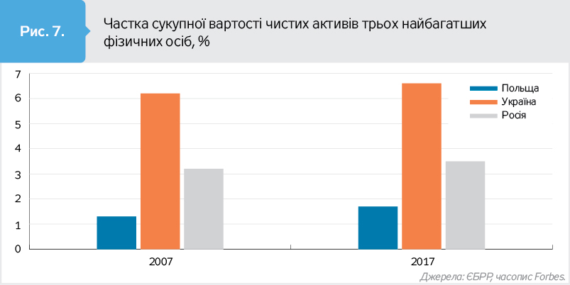 Неповні реформи призвели до численних спотворень ринку та створили широкі можливості для арбітражних операцій, які забезпечували дуже сконцентроване одержання ренти потужними впливовими зацікавленими групами. Свою роль у цих процесах також відіграла поява "проміжних переможців", які отримували для себе користь від економічної системи, що не була ні повністю реформованою, ні повністю прозорою. Що, у свою чергу, заважало здійсненню подальших змін. "Ці групи особливо активно протидіяли реформам, здатним підірвати їхню монополію або ліквідувати джерела ренти. Зазначені проблеми у сфері врядування призвели до формування економіки, побудованої навколо перерозподілу ренти, - зазначають дослідники. - У 2017 р. сукупна чиста вартість активів трьох найбагатших фізичних осіб України перевищувала 6% ВВП України". Це майже вдвічі більше, ніж у Росії, та втричі більше, ніж у Польщі (див. рис. 7). При цьому відношення частки доходу, накопиченої найбагатшими громадянами України, до ВВП залишилося майже незмінним з 2007 р. Це обмежило доступ до економічних можливостей, здатних повністю розкрити потенціал людського капіталу України.