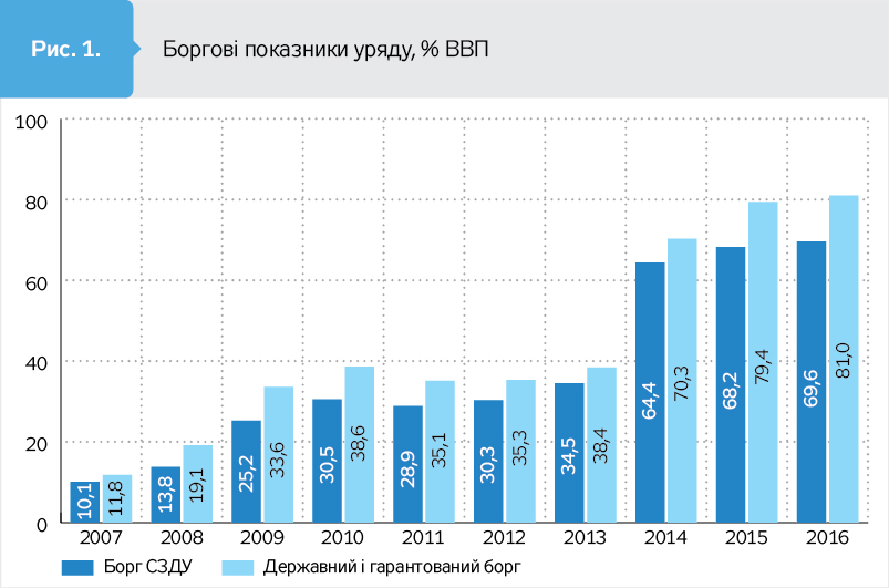 Порівнюючи боргове навантаження уряду з аналогами для інших країн, в Україні помилково співставляють державний і гарантований державою борг із боргом сектору загального державного управління (general government). Ці показники є близькими, однак не тотожними (див. рис. 1). Відмінність полягає в тому, що гарантований державою борг - це переважно зобов'язання держкорпорацій, які не входять до сектору загального державного управління (СЗДУ). З іншого боку, державний і гарантований державою борг не враховує боргових зобов'язань місцевих органів влади.