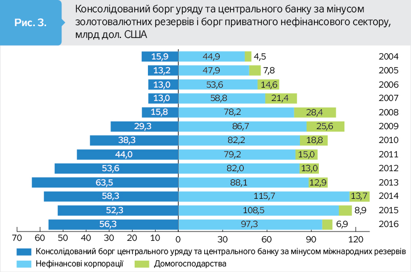 Під час кризових періодів не лише уряд відіграє роль кредитора останньої надії. Виконувати цю функцію йому допомагає центральний банк. На рис. 3 відображено консолідований борг уряду та центрального банку, з одного боку, та нефінансових корпорацій і домогосподарств - з іншого. Варто зауважити також, що, попри тривалий період сприятливої зовнішньої кон'юнктури з