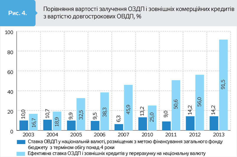 У результаті рекапіталізації банківської системи за рахунок коштів уряду частка банків, підконтрольних уряду, зросла до понад 50% банківської системи. Відповідно, частка ОВДП, що перебувають у власності пов'язаних із урядом фінансових установ, у тому числі НБУ, сягнула 70%. Дохідність портфеля ОВДП, придбаних зазначеними установами, здебільшого не покриває інфляції і є значно нижчою від ринкових ставок на момент їх розміщення. На рис. 4 відображено, наскільки вартість залучення ОЗДП і зовнішніх комерційних кредитів перевищує вартість довгострокових ОВДП, розміщених серед підконтрольних уряду фінансових установ.