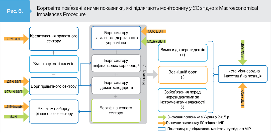 З метою раннього попередження подібних проблем у ЄС було затверджено Процедуру макроекономічних дисбалансів, яка серед іншого передбачає моніторинг таких боргових показників (див. рис. 6):