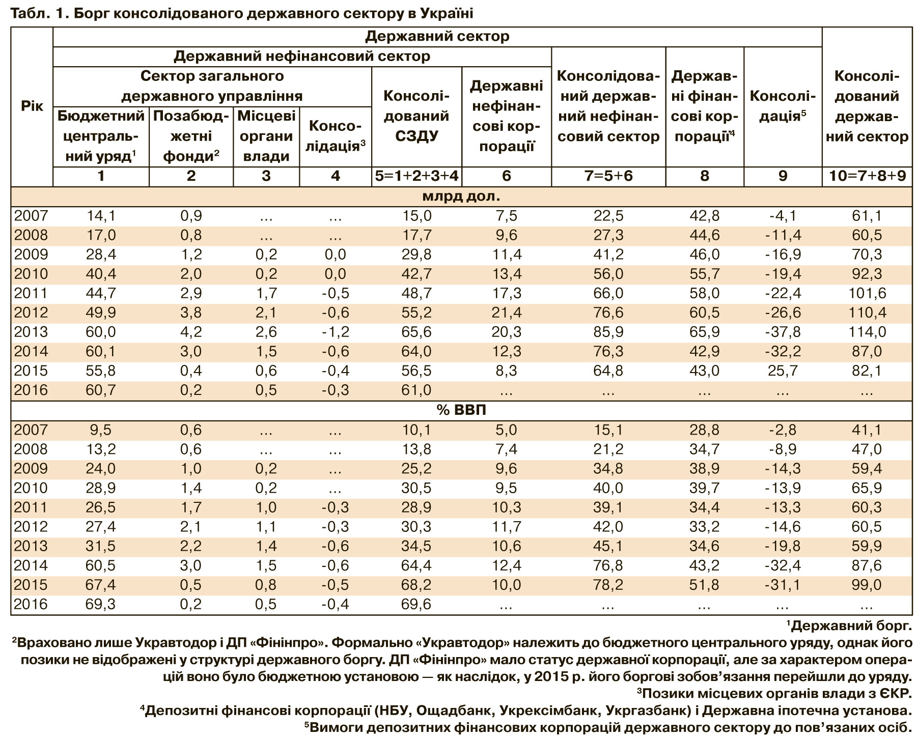 У кризові періоди боргове навантаження перерозподіляється між урядом і держкорпораціями за рахунок того, що уряд бере на себе частину надмірних зобов'язань інших підсекторів держсектору. Якщо у 2007 р. відношення держборгу до боргу всього держсектору становило 60%, то у 2014 р. воно збільшилося до 80% (див. табл. 1).