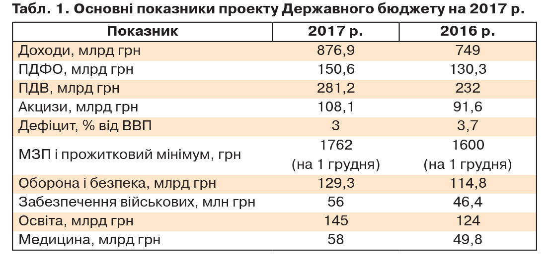 Уряд передбачив збільшення бюджету України у 2017 р. майже на 17%, до 876 млрд грн. Уже дивно з урахуванням того, що економічне зростання заплановане в 3%, інфляція за прогнозами буде 8%, а збільшення податкових ставок, за словами прем'єра, не планується. Щоправда, із застереженням про можливе розширення бази та перегляд ренти. Раніше Мінфіном також озвучувалася індексація акцизних ставок, а експертами - можливість їх більш радикального підвищення. Принаймні кота в мішку бізнесу очікувати варто. Бажання вписатися в норматив МВФ уже зіграло з нами злий жарт цього року, зіграє і наступного. Дефіцит бюджету, який 2017-го не має перевищувати 3%, передбачувано становить 77,5 млрд грн.