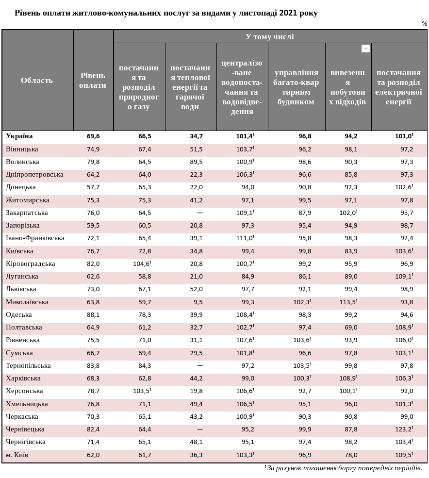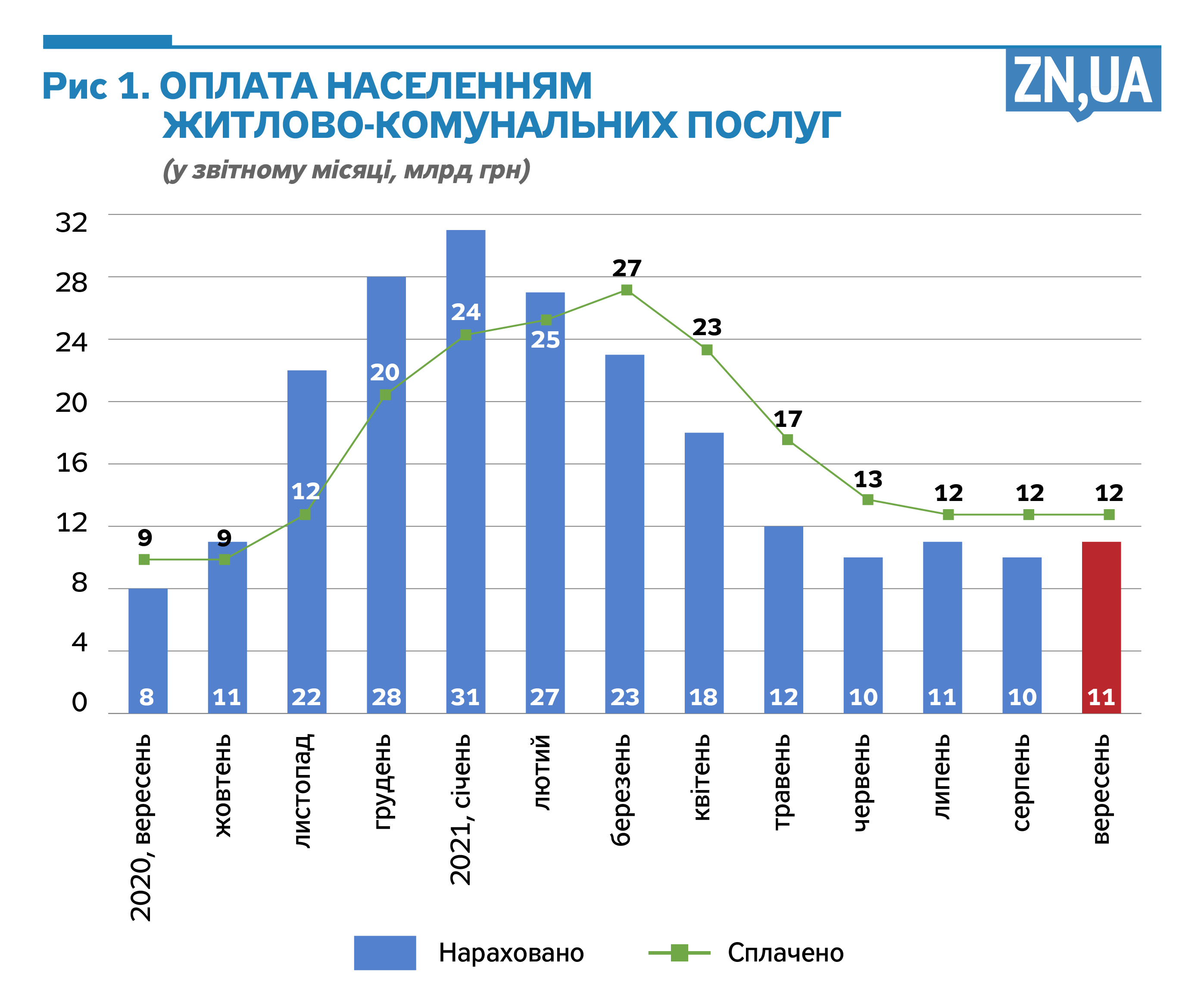 Так, у вересні 2021 року, до початку опалювального сезону, українці, активно погашаючи борги попередніх періодів, заплатили за житлово-комунальні послуги 12,2 млрд грн (111,3%). А щойно опалювальний сезон розпочався (хоча платіжки за нього ще не надходили), споживачі різко зменшили платежі, при цьому в загальному обсязі вони становлять порівнянну з попереднім місяцем цифру 12,4 млрд грн, але у відсотковому співвідношенні це — 75,4%.