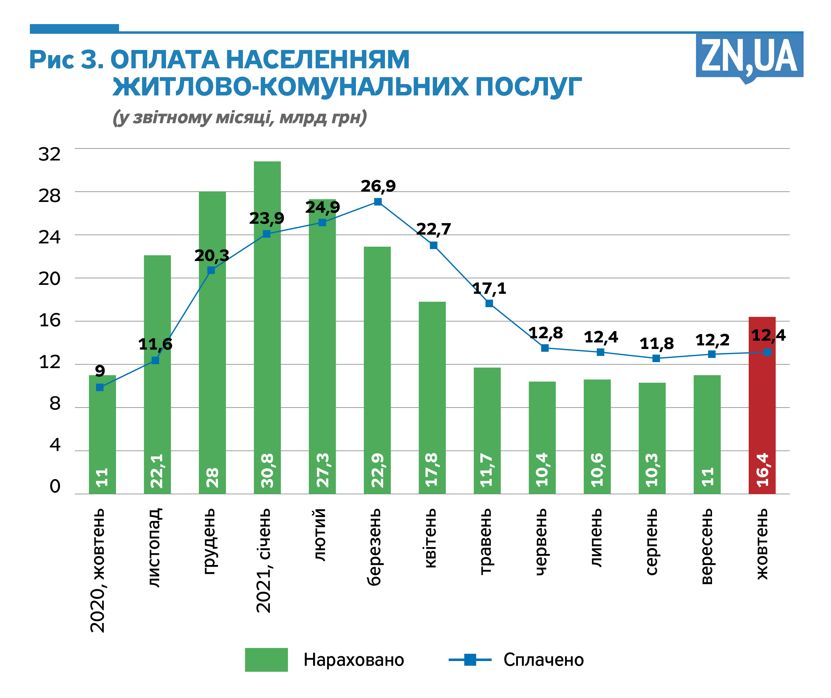 Однак, коли проаналізувати нарахування за місяцями, порівняно з сезоном 2020–2021 рр., виходить, що українцям нарахували на 50% більше. Так, якщо у жовтні 2020 року нарахування становили 11 млрд грн, то вже в жовтні 2021-го — 16,4 млрд.