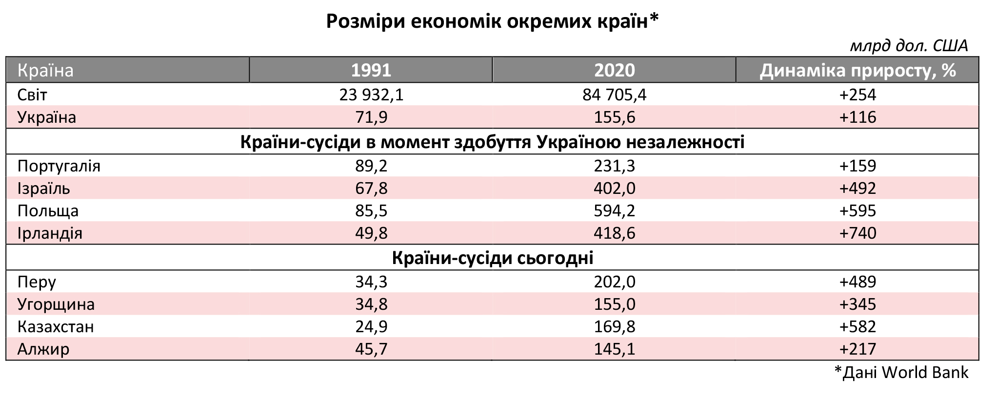 Круглі дати найчастіше слугують джерелом для численних доповідей і повідомлень про те, як багато зроблено, й практично ніколи про те, чого не зробили й чому. Далекого1991 року, після розвалу СРСР, економічний потенціал країни був порівнянний з економіками Португалії, Ізраїлю, Польщі й майже в півтора рази перевищував економіку Ірландії. Через три десятиліття країни — колишні сусіди пішли далеко вперед. Так, найбільш некваплива економіка — португальська — зростала в 1,4 разу швидше за українську. І нині вже громадяни Перу, Угорщини, Казахстану й Алжиру живуть у порівнянних за розміром з нашою економіках (див. табл.).