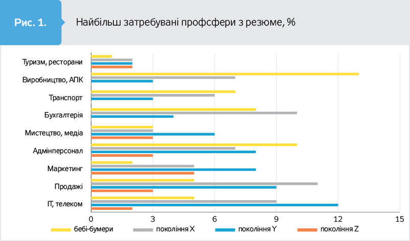 Роботодавці, які шукали чи шукають співробітників для адміністративної роботи (водіїв, адміністраторів господарчих відділів, прибиральниць тощо), на виробництво чи в агрокомпанію (інженерів, керівників цехів, технологів, конструкторів, спеціалістів із контролю за якістю тощо), знають, що часто такими вакансіями цікавляться бебі-бумери. Покоління X приваблює робота в ритейлі та бухгалтерії. Потрібен IT-шник чи маркетолог - чекайте на купу резюме від міленіалів. Говорити щось про переваги "зетів" іще досить рано. Проте вже зараз помітне їхнє прагнення працювати в мистецтві, медіа та IT-секторі.