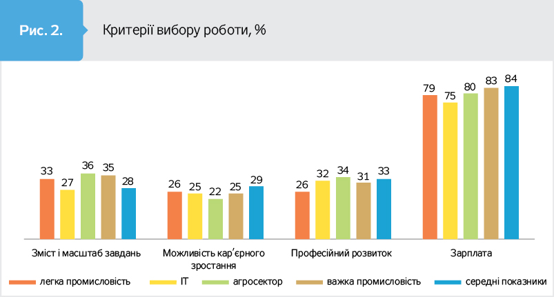Наприклад, ні в кого не викликає сумнівів той факт, що розмір заробітної плати загалом є найважливішим для всіх учасників опитування. Проте певною мірою він є менш цінним для тих респондентів, які цікавляться роботою в IT (див. рис. 2). Згадаймо, що йдеться здебільшого про міленіалів. А згідно з даними досліджень Інституту Геллапа, вони працюють не стільки заради грошей, скільки заради самореалізації та великої мети.