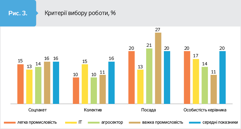 Наявність соціального пакета, як і офіційного оформлення, важливіша для пошукачів, котрі зацікавлені в роботі у промисловості. Ці критерії є певним гарантом стабільності, якій надають перевагу досвідчені кандидати поколінь бебі-бумерів та X (див. рис. 3).