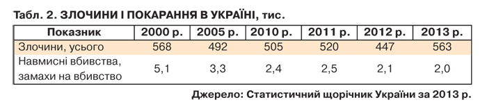 Із зайвою жорсткістю законів також можна погодитися лише частково. Наприклад, раніше в нас діяв закон про смертну кару. Але з його скасуванням у 2003 р. кількість убивств не збільшилася, а зменшилася, що видно з табл.2.